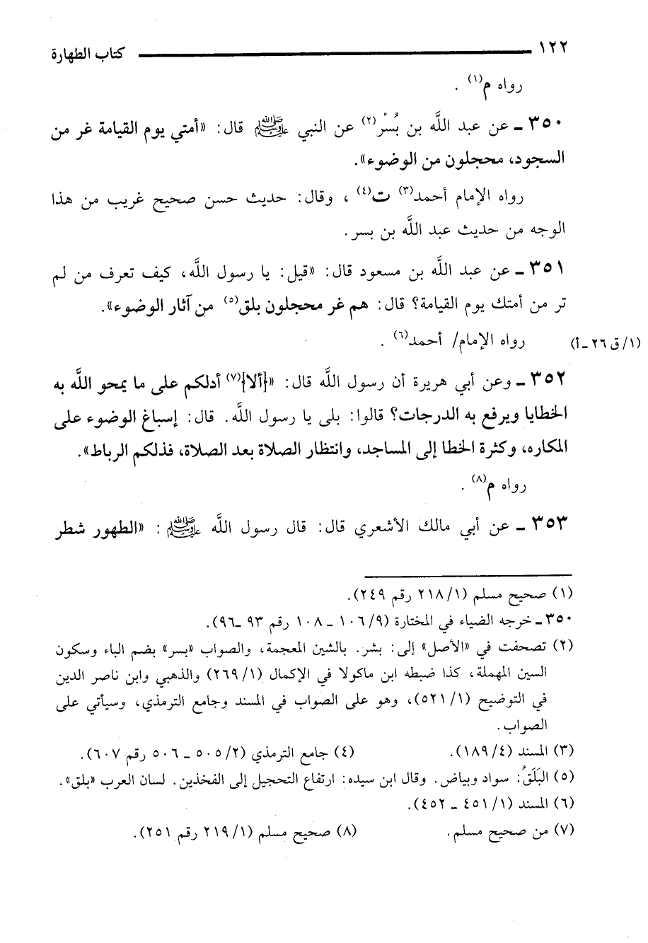 350 - عن عبد الله بن بُسْر (¬2) عن النبي - صلى الله عليه وسلم - قال: "أمتي يوم القيامة غر من السجود، محجلون من الوضوء".