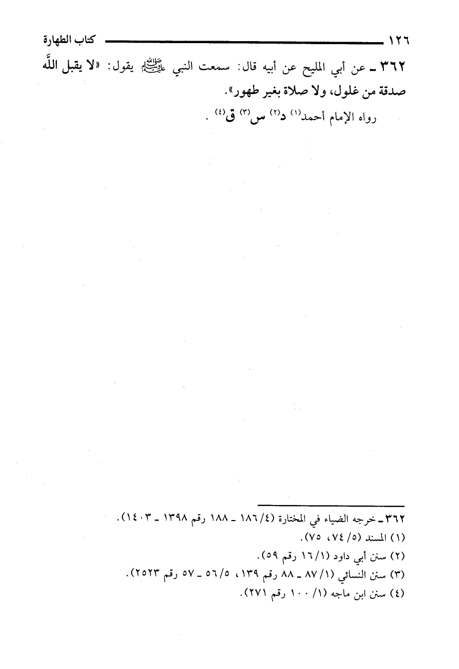 362 - عن أبي المليح عن أبيه قال: سمعت النبي - صلى الله عليه وسلم - يقول: "لا يقبل الله صدقة من غلول، ولا صلاة بغير طهور".