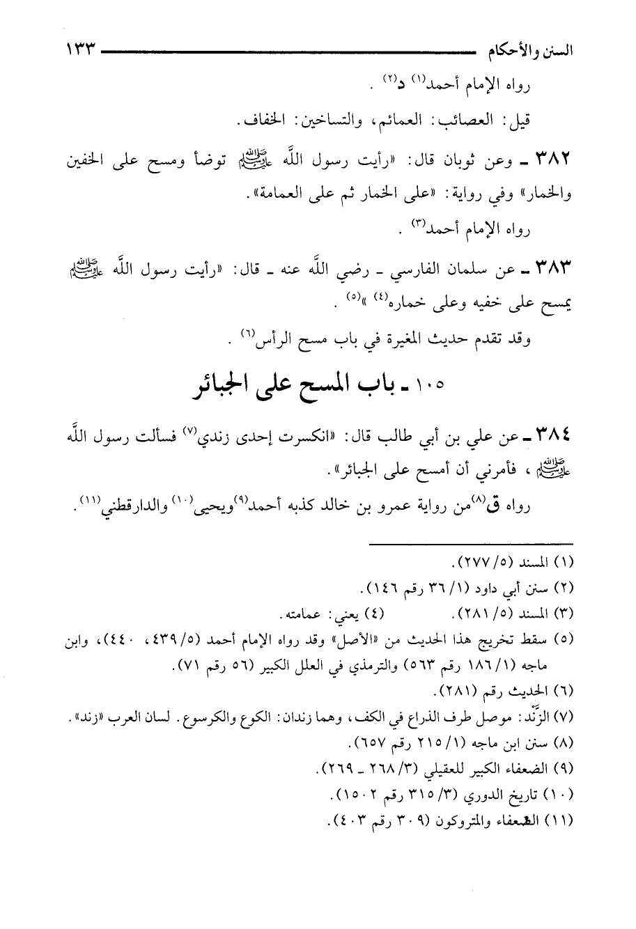 384 - عن علي بن أبي طالب قال: "انكسرت إحدى زندي (¬7) فسألت رسول الله - صلى الله عليه وسلم -، فأمرني أن أمسح على الجبائر".