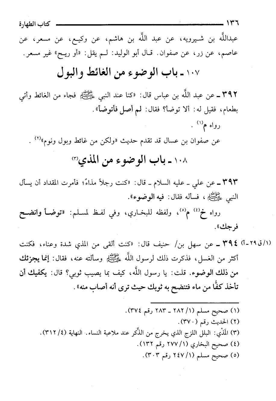 394 - عن سهل بن حنيف قال: "كنت ألقى من المذي شدة وعناء، فكنت أكثر من الغسل، فذكرت ذلك لرسول الله - صلى الله عليه وسلم - وسألته عنه، فقال: إنما يجزئك من ذلك الوضوء. قلت: يا رسول الله، كيف بما يصيب ثوبي؟ قال: يكفيك أن تأخذ كفًّا من ماء فتنضح به ثوبك حيث ترى أنه أصاب منه".