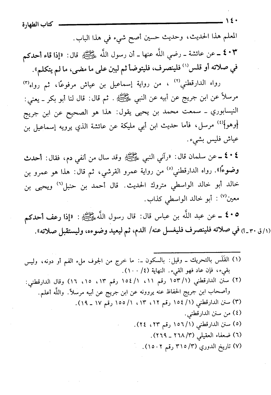 404 - عن سلمان قال: "رآني النبي - صلى الله عليه وسلم - وقد سال من أنفي دم، فقال: أحدث وضوءًا". رواه الدارقطني (¬5) من رواية عمرو القرشي، ثم قال: هذا هو عمرو بن خالد أبو خالد الواسطي متروك الحديث. قال أحمد بن حنبل (¬6) ويحيى بن معين (¬7): أبو خالد الواسطي كذاب.