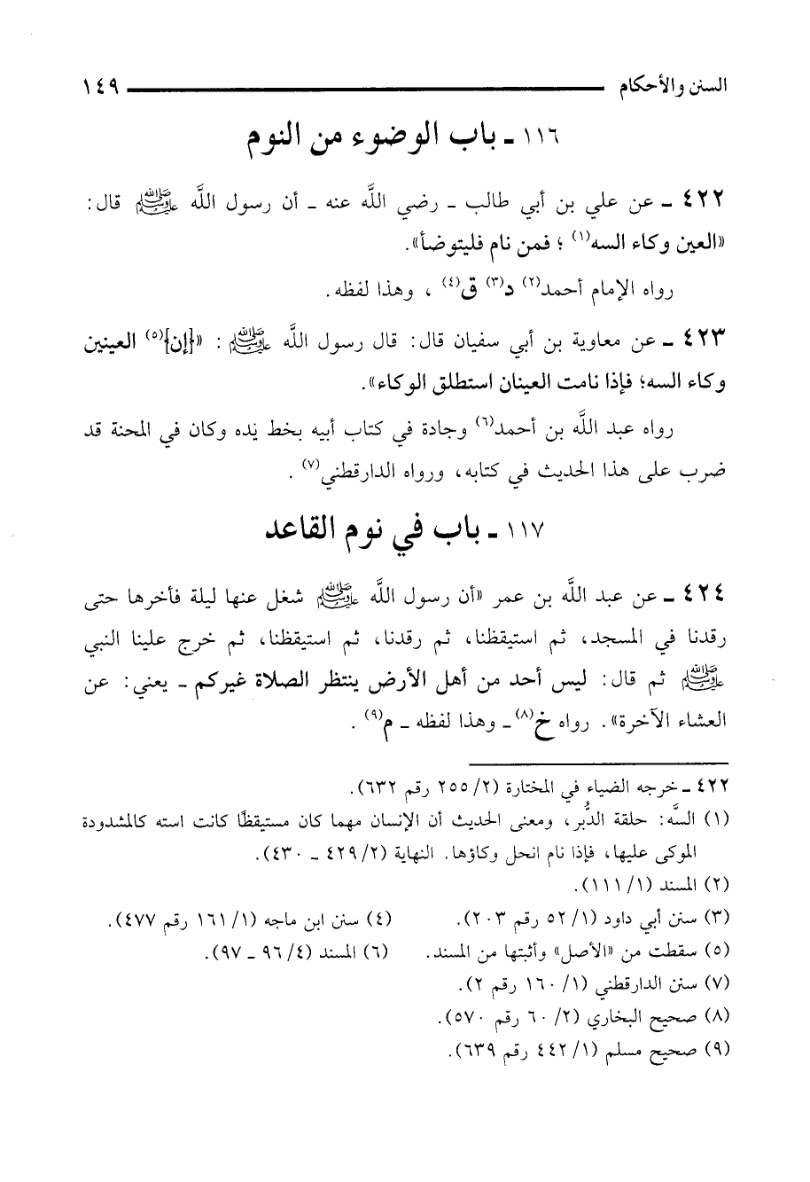 422 - عن علي بن أبي طالب -رضي الله عنه- أن رسول الله قال: "العين وكاء السه (¬1)؛ فمن نام فليتوضأ".