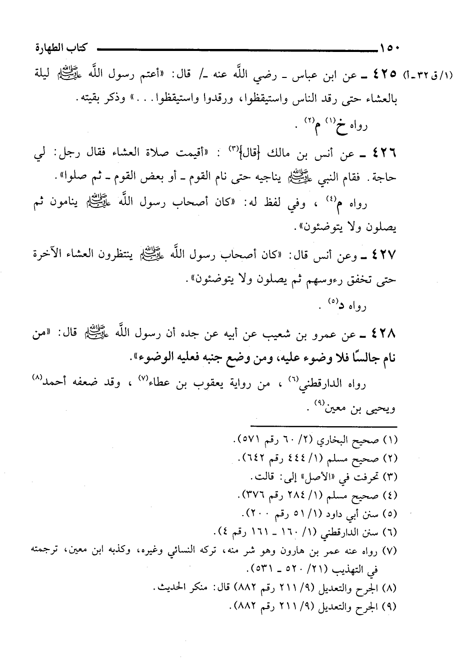427 - وعن أنس قال: "كان أصحاب رسول الله - صلى الله عليه وسلم - ينتظرون العشاء الآخرة حتى تخفق رءوسهم ثم يصلون ولا يتوضئون".