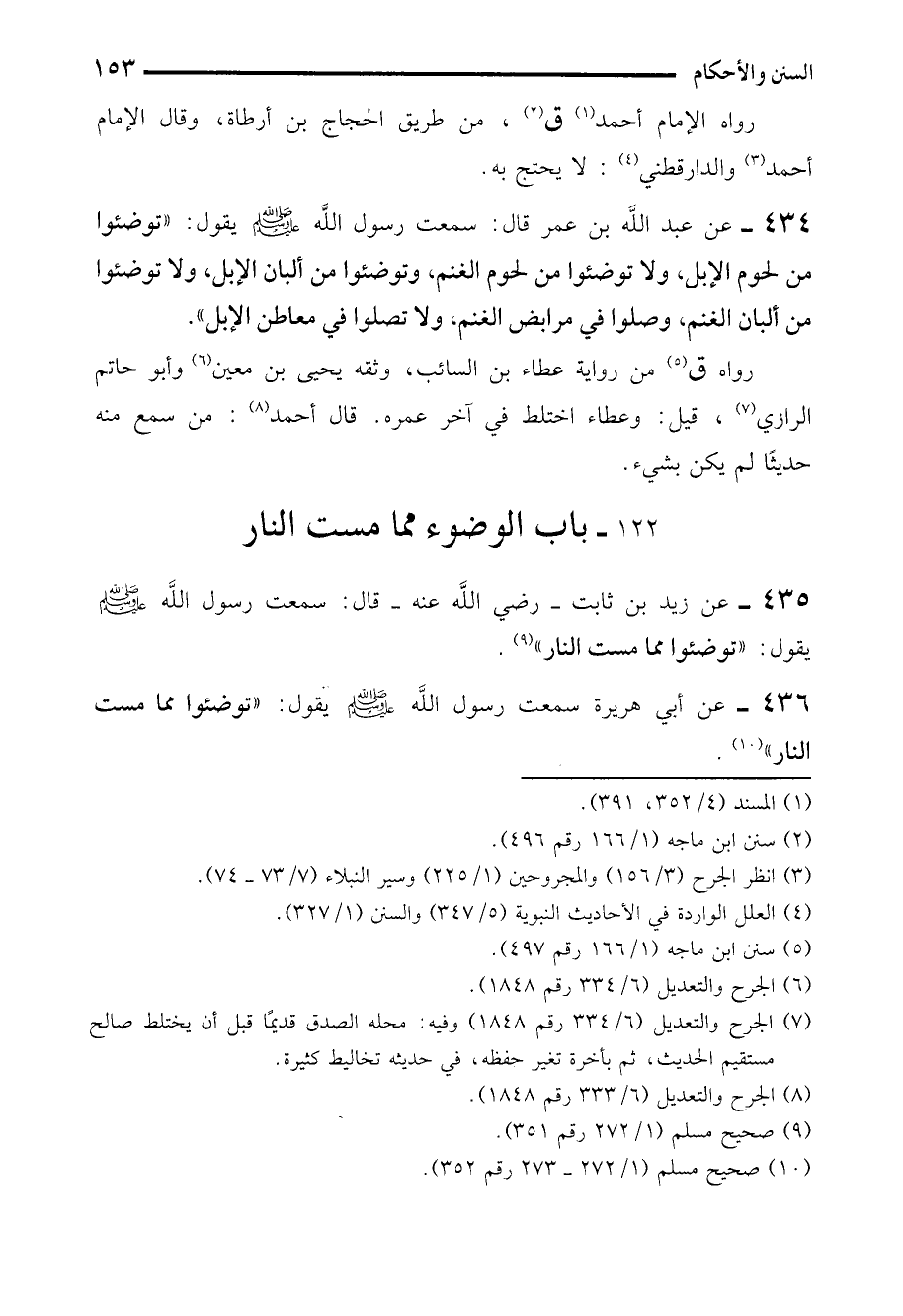 434 - عن عبد الله بن عمر قال: سمعت رسول الله - صلى الله عليه وسلم - يقول: "توضئوا من لحوم الإبل، ولا توضئوا من لحوم الغنم، وتوضئوا من ألبان الإبل، ولا توضئوا من ألبان الغنم، وصلوا في مرابض الغنم، ولا تصلوا في معاطن الإبل".