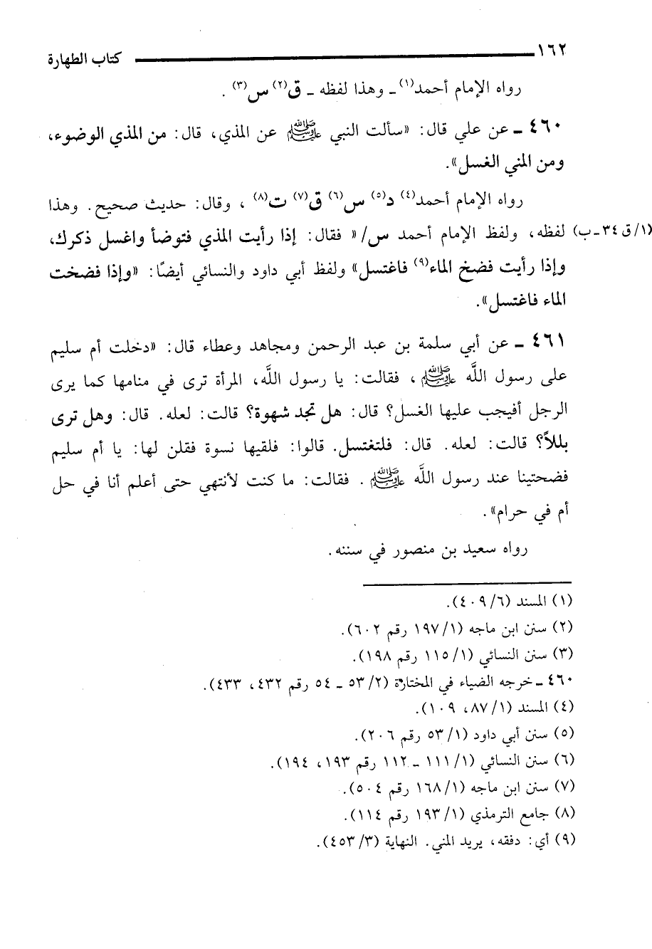 رواه الإمام أحمد (¬4) د (¬5) س (¬6) ق (¬7) ت (¬8)، وقال: حديث صحيح. وهذا لفظه، ولفظ الإمام أحمد س "فقال: إذا رأيت المذي فتوضأ واغسل ذكرك، وإذا رأيت فضخ الماء (¬9) فاغتسل" ولفظ أبي داود والنسائي أيضًا: "وإذا فضخت الماء فاغتسل".