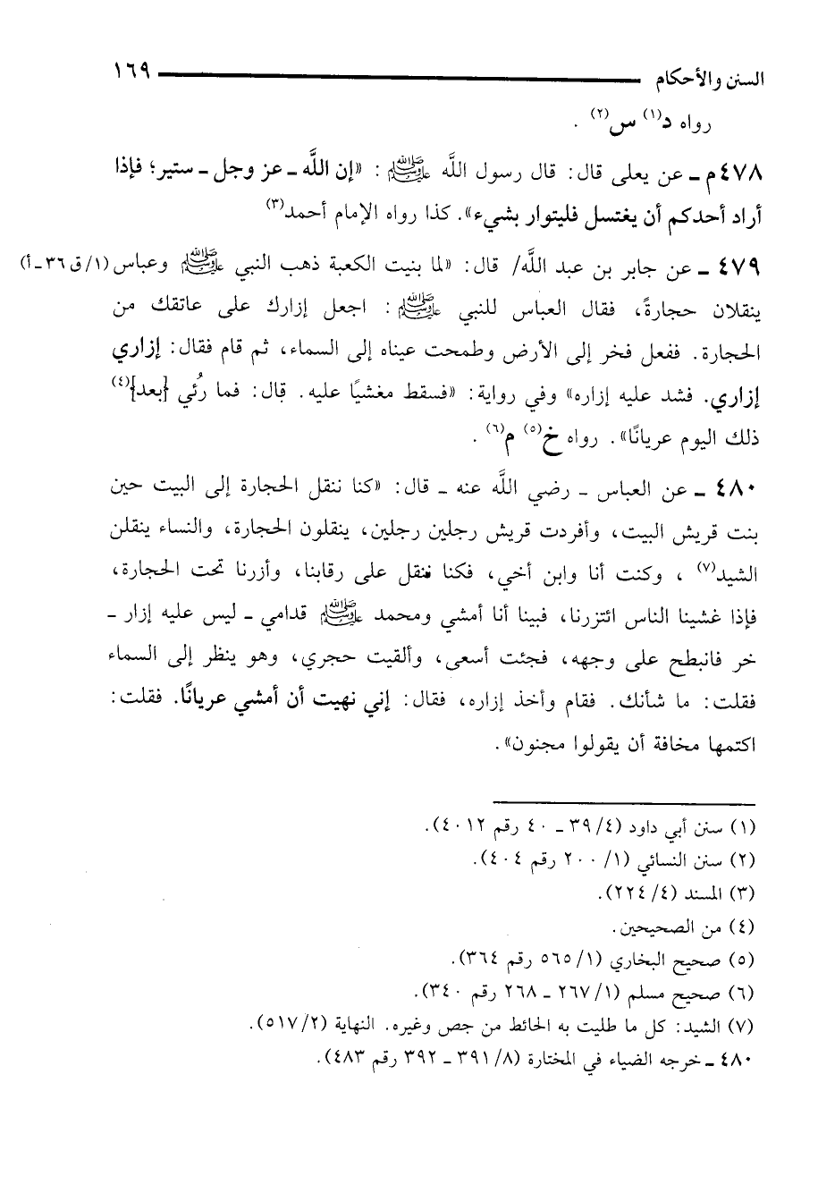 479 - عن جابر بن عبد الله قال: "لما بنيت الكعبة ذهب النبي - صلى الله عليه وسلم - وعباس ينقلان حجارةً، فقال العباس للنبي - صلى الله عليه وسلم -: اجعل إزارك على عاتقك من الحجارة. ففعل فخر إلى الأرض وطمحت عيناه إلى السماء، ثم قام فقال: إزاري إزاري. فشد عليه إزاره" وفي رواية: "فسقط مغشيًا عليه. قال: فما رُئي (بعد) (¬4) ذلك اليوم عريانًا". رواه خ (¬5) م (¬6).