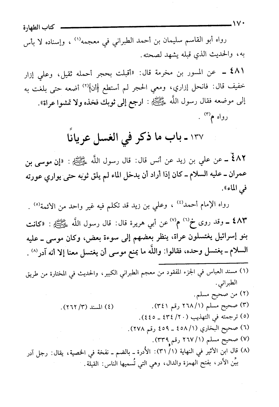 481 - عن المسور بن مخرمة قال: "أقبلت بحجر أحمله ثقيل، وعلي إزار خفيف قال: فانحل إزاري، ومعي الحجر لم أستطع (أن) (¬2) أضعه حتى بلغت به إلى موضعه فقال رسول الله - صلى الله عليه وسلم -: ارجع إلى ثوبك فخذه ولا تمشوا عراة".