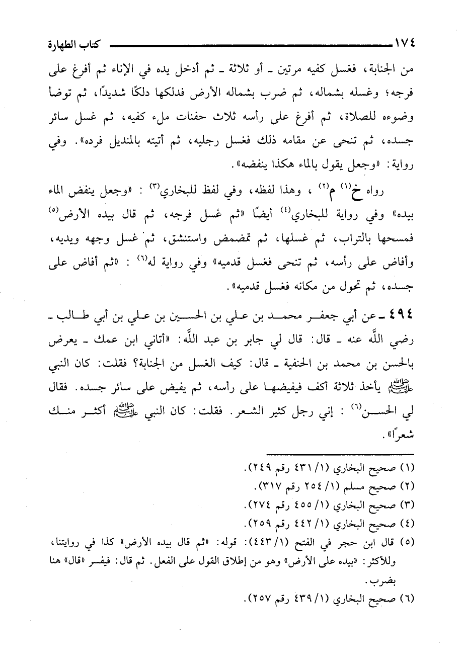 494 - عن أبي جعفر محمد بن علي بن الحسين بن علي بن أبي طالب -رضي الله عنه- قال: قال لي جابر بن عبد الله: "أتاني ابن عمك -يعرض بالحسن بن محمد بن الحنفية- قال: كيف الغسل من الجنابة؟ فقلت: كان النبي - صلى الله عليه وسلم - يأخذ ثلاثة أكف فيفيضها على رأسه، ثم يفيض على سائر جسده. فقال لي الحسن (6): إني رجل كثير الشعر. فقلت: كان النبي - صلى الله عليه وسلم - أكثر منك شعرًا".