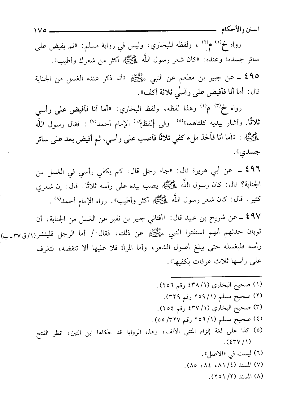 497 - عن شريح بن عبيد قال: "أفتاني جبير بن نفير عن الغسل من الجنابة، أن ثوبان حدثهم أنهم استفتوا النبي - صلى الله عليه وسلم - عن ذلك، فقال: أما الرجل فلينشر رأسه فليغسله حتى يبلغ أصول الشعر، وأما المرأة فلا عليها ألا تنقضه؛ لتغرف على رأسها ثلاث غرفات بكفيها".