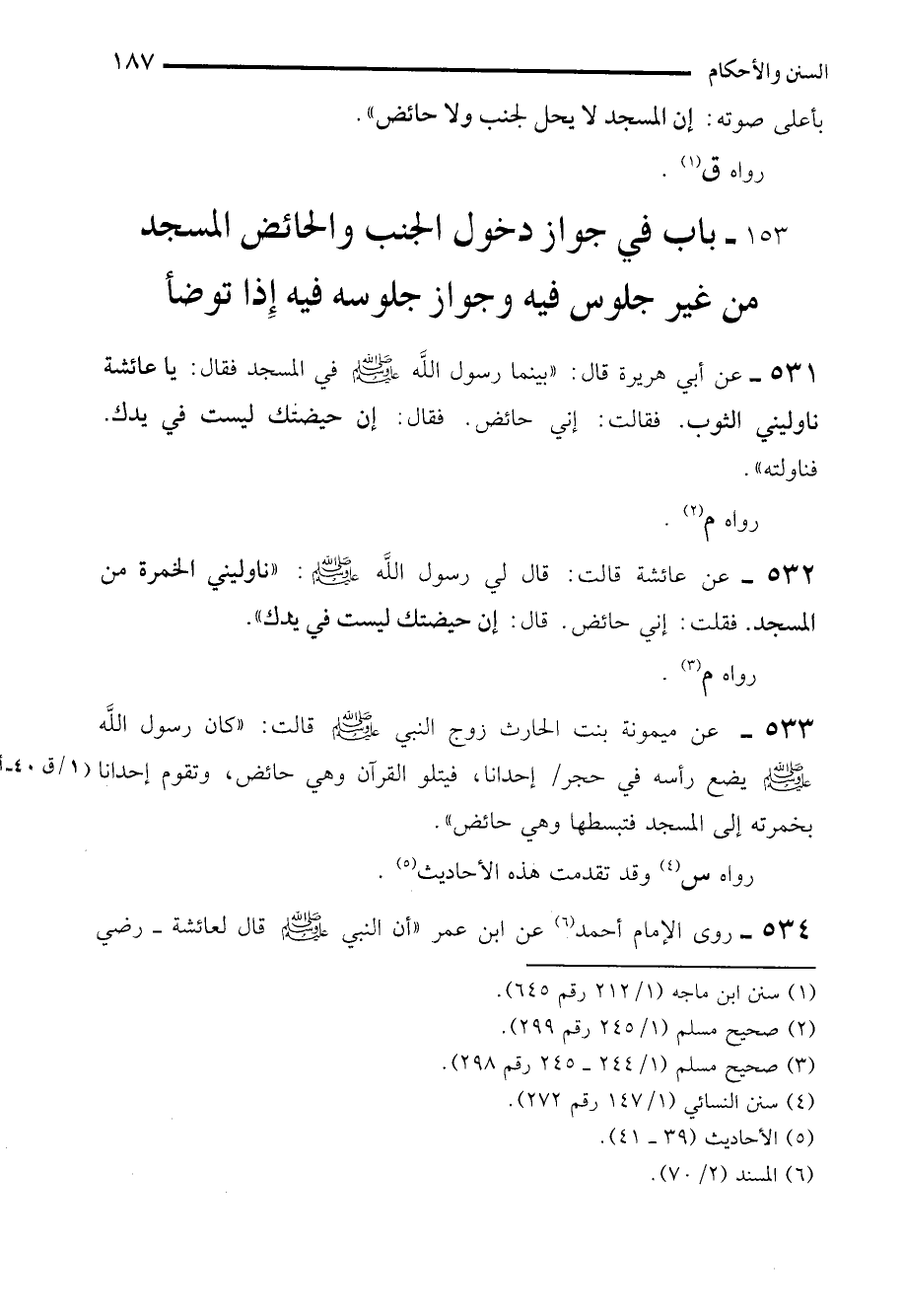 531 - عن أبي هريرة قال: "بينما رسول الله - صلى الله عليه وسلم - في المسجد فقال: يا عائشة ناوليني الثوب. فقالت: إني حائض. فقال: إن حيضتك ليست في يدك. فناولته".
