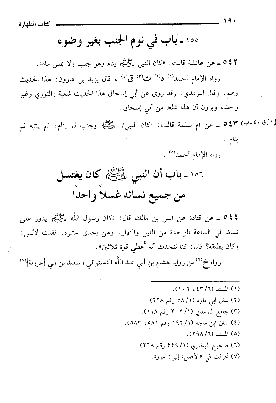 542 - عن عائشة قالت: "كان النبي - صلى الله عليه وسلم - ينام وهو جنب ولا يمس ماء".