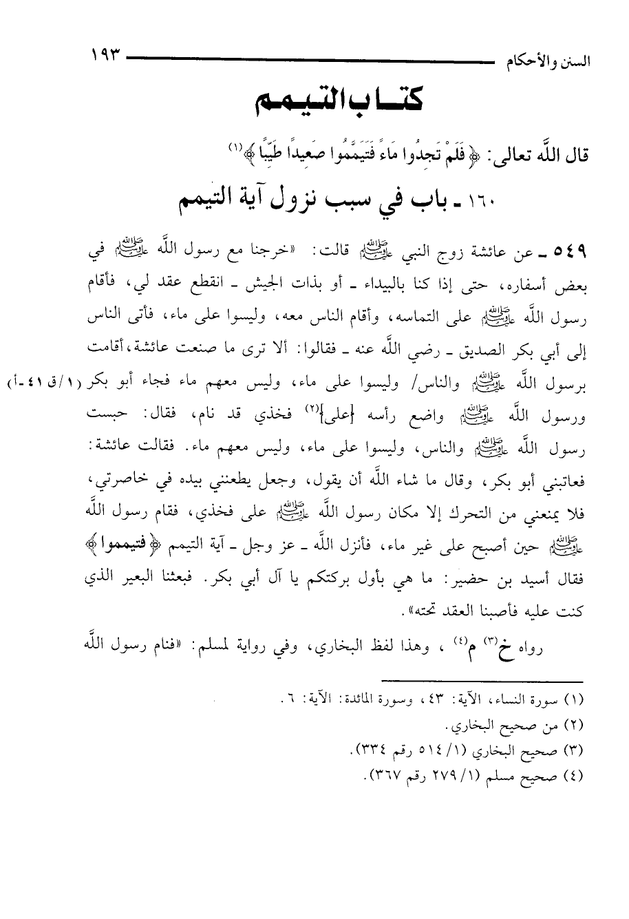 549 - عن عائشة زوج النبي - صلى الله عليه وسلم - قالت: "خرجنا مع رسول الله - صلى الله عليه وسلم - في بعض أسفاره، حتى إذا كنا بالبيداء -أو بذات الجيش- انقطع عقد لي، فأقام رسول الله - صلى الله عليه وسلم - على التماسه، وأقام الناس معه، وليسوا على ماء، فأتى الناس إلى أبي بكر الصديق -رضي الله عنه- فقالوا: ألا ترى ما صنعت عائشة، أقامت برسول الله - صلى الله عليه وسلم - والناس وليسوا على ماء، وليس معهم ماء فجاء أبو بكر ورسول الله - صلى الله عليه وسلم - واضع رأسه (على) (¬2) فخذي قد نام، فقال: حبست رسول الله - صلى الله عليه وسلم - والناس، وليسوا على ماء، وليس معهم ماء. فقالت عائشة: فعاتبني أبو بكر، وقال ما شاء الله أن يقول، وجعل يطعنني بيده في خاصرتي، فلا يمنعني من التحرك إلا مكان رسول الله - صلى الله عليه وسلم - على فخذي، فقام رسول الله - صلى الله عليه وسلم - حين أصبح على غير ماء، فأنزل الله -عز وجل- آية التيمم (فتيمموا) فقال أسيد بن حضير: ما هي بأول بركتكم يا آل أبي بكر. فبعثنا البعير الذي كنت عليه فأصبنا العقد تحته".