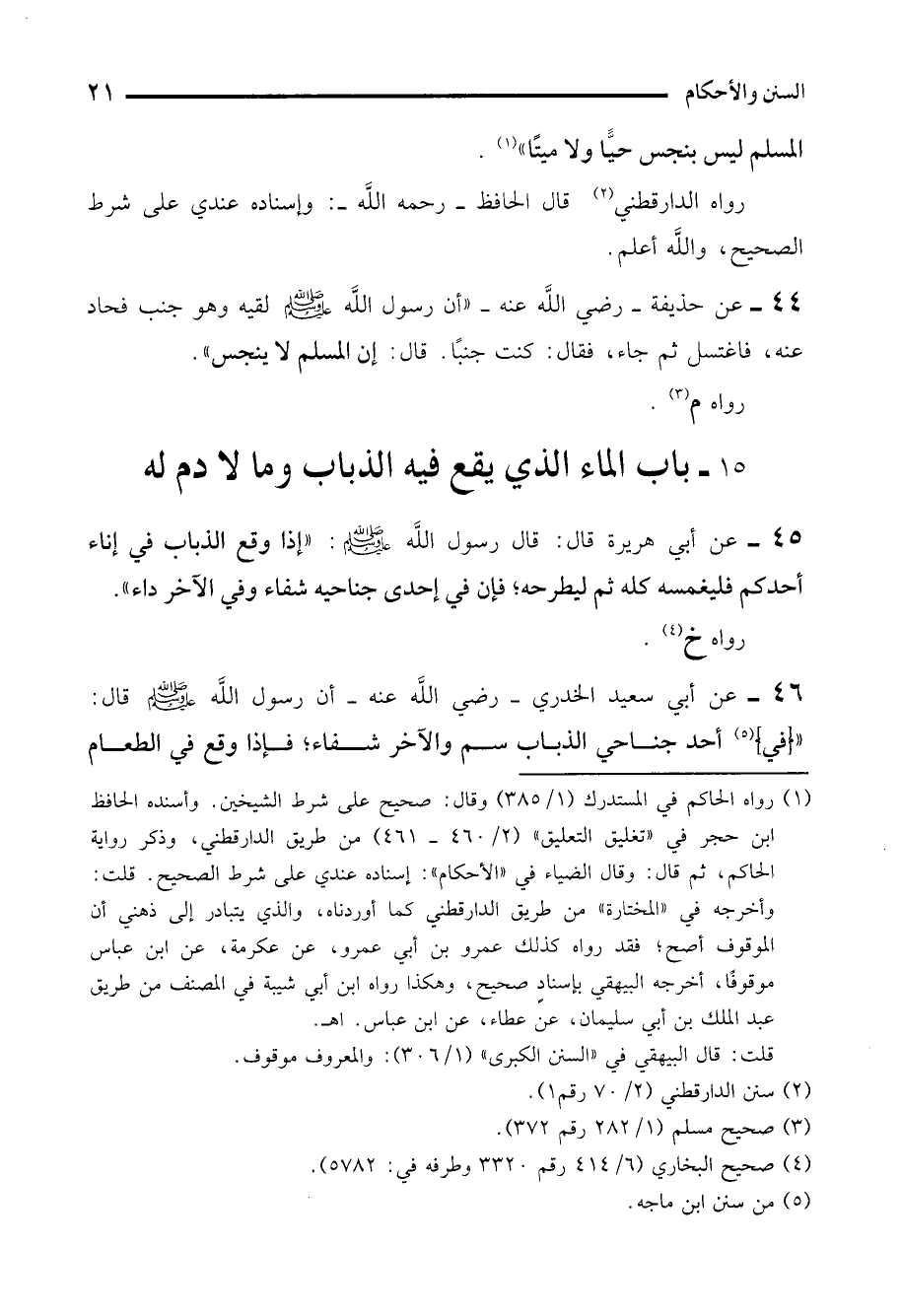 44 - عن حذيفة -رضي الله عنه- "أن رسول الله - صلى الله عليه وسلم - لقيه وهو جنب فحاد عنه، فاغتسل ثم جاء، فقال: كنت جنبًا. قال: إن المسلم لا ينجس".