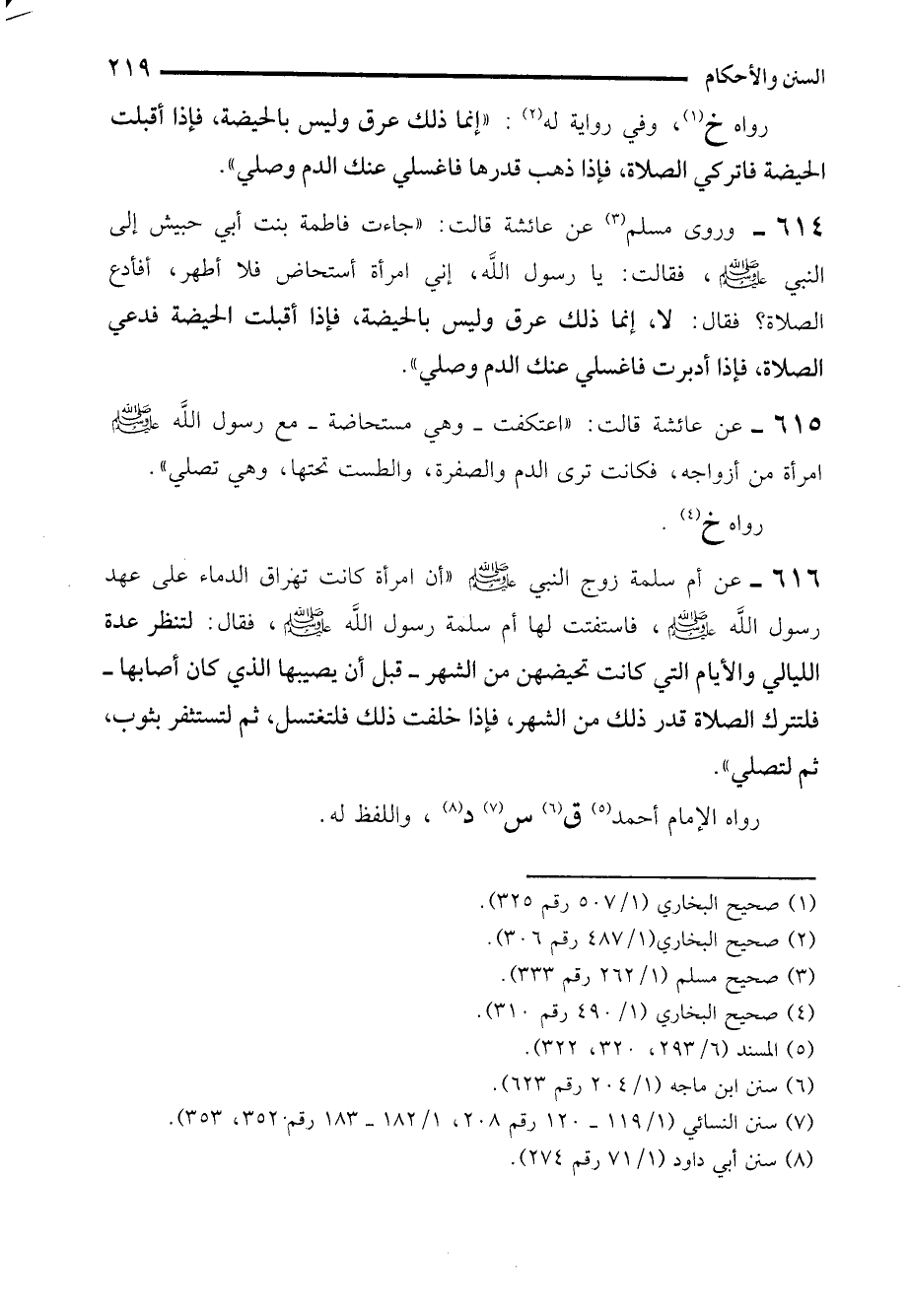 616 - عن أم سلمة زوج النبي - صلى الله عليه وسلم - "أن امرأة كانت تفراق الدماء على عهد رسول الله - صلى الله عليه وسلم - فاستفتت لها أم سلمة رسول الله - صلى الله عليه وسلم - فقال: لتنظر عدة الليالي والأيام التي كانت تحيضهن من الشهر -قبل أن يصيبها الذي كان أصابها- فلتترك الصلاة قدر ذلك من الشهر، فإذا خلفت ذلك فلتغتسل، ثم لتستثفر بثوب، ثم لتصلي".