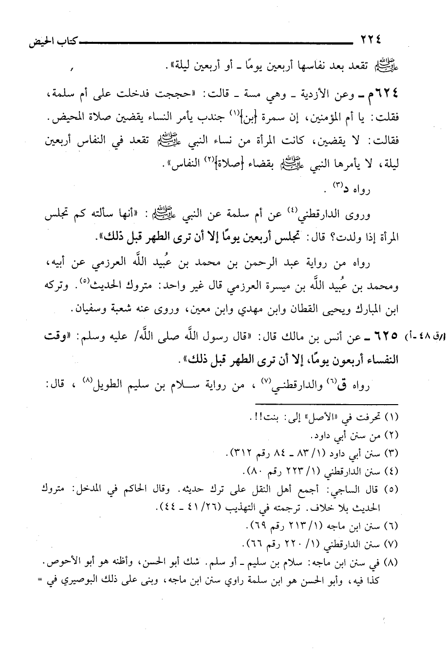 625 - عن أنس بن مالك قال: "قال رسول الله صلى الله عليه وسلم: "وقت النفساء أربعون يومًا، إلا أن ترى الطهر قبل ذلك".