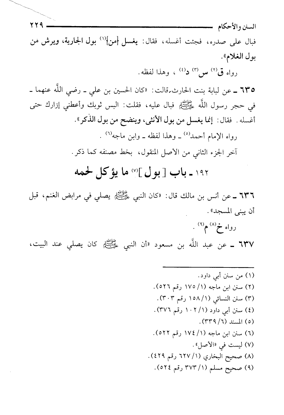 635 - عن لبابة بنت الحارث قالت: "كان الحسين بن علي -رضي الله عنهما- في حجر رسول الله - صلى الله عليه وسلم - فبال عليه، فقلت: البس ثوبك وأعطني إزارك حتى أغسله. فقال: إنما يغسل من بول الأنثى، وينضح من بول الذكر".