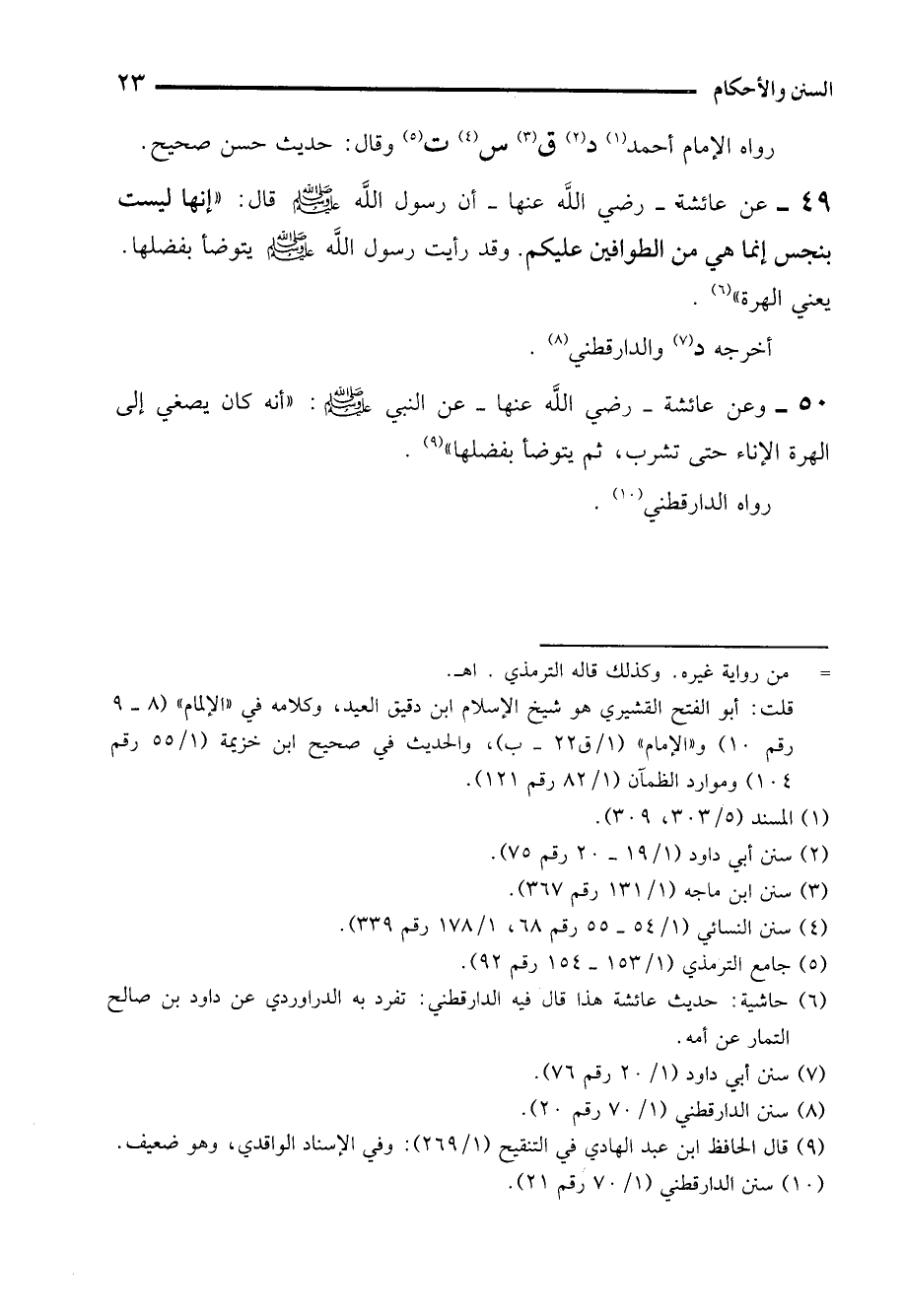 49 - عن عائشة -رضي الله عنها- أن رسول الله - صلى الله عليه وسلم - قال: "إنها ليست بنجس إنما هي من الطوافين عليكم. وقد رأيت رسول الله - صلى الله عليه وسلم - يتوضأ بفضلها. يعني الهرة" (¬6).