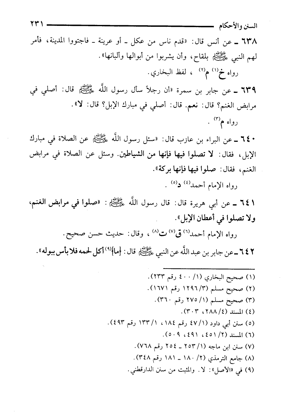 639 - عن جابر بن سمرة "أن رجلاً سأل رسول الله - صلى الله عليه وسلم - قال: أصلي في مرابض الغنم؟ قال: نعم. قال: أصلي في مبارك الإبل؟ قال: لا".
