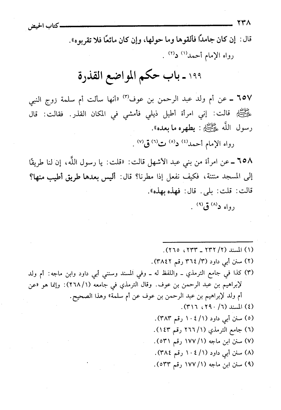 657 - عن أم ولد عبد الرحمن بن عوف (¬3) "أنها سألت أم سلمة زوج النبي - صلى الله عليه وسلم - قالت: إني امرأة أطيل ذيلي فأمشي في المكان القذر. فقالت: قال رسول الله - صلى الله عليه وسلم -: يطهره ما بعده".
