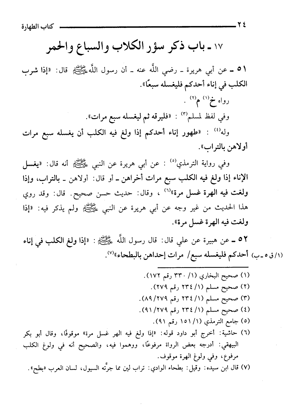 51 - عن أبي هريرة -رضي الله عنه- أن رسول الله - صلى الله عليه وسلم - قال: "إذا شرب الكلب في إناء أحدكم فليغسله سبعًا".