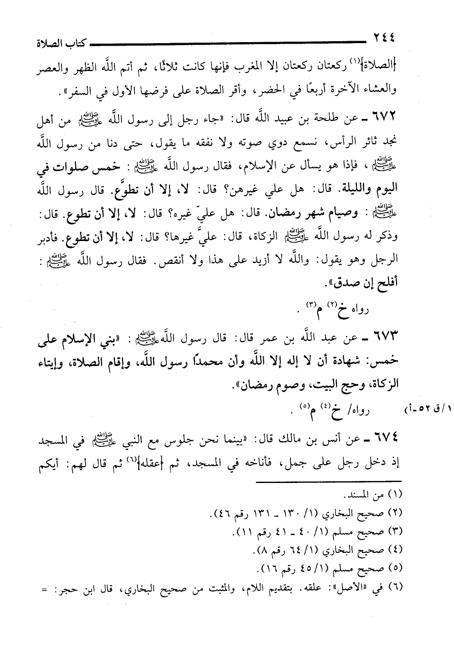 672 - عن طلحة بن عبيد الله قال: "جاء رجل إلى رسول الله - صلى الله عليه وسلم - من أهل نجد ثائر الرأس، نسمع دوي صوته ولا نفقه ما يقول، حتى دنا من رسول الله - صلى الله عليه وسلم - فإذا هو يسأل عن الإسلام، فقال رسول الله - صلى الله عليه وسلم -: خمس صلوات في اليوم والليلة. قال: هل علي غيرهن؟ قال: لا، إلا أن تطوعَّ. قال رسول الله - صلى الله عليه وسلم -: وصيام شهر رمضان. قال: هل عليّ غيره؟ قال: لا، إلا أن تطوع. قال: وذكر له رسول الله - صلى الله عليه وسلم - الزكاة، قال: عليَّ غيرها؟ قال: لا، إلا أن تطوع. فأدبر الرجل وهو يقول: واللَّه لا أزيد على هذا ولا أنقص. فقال رسول الله - صلى الله عليه وسلم - أفلح إن صدق".