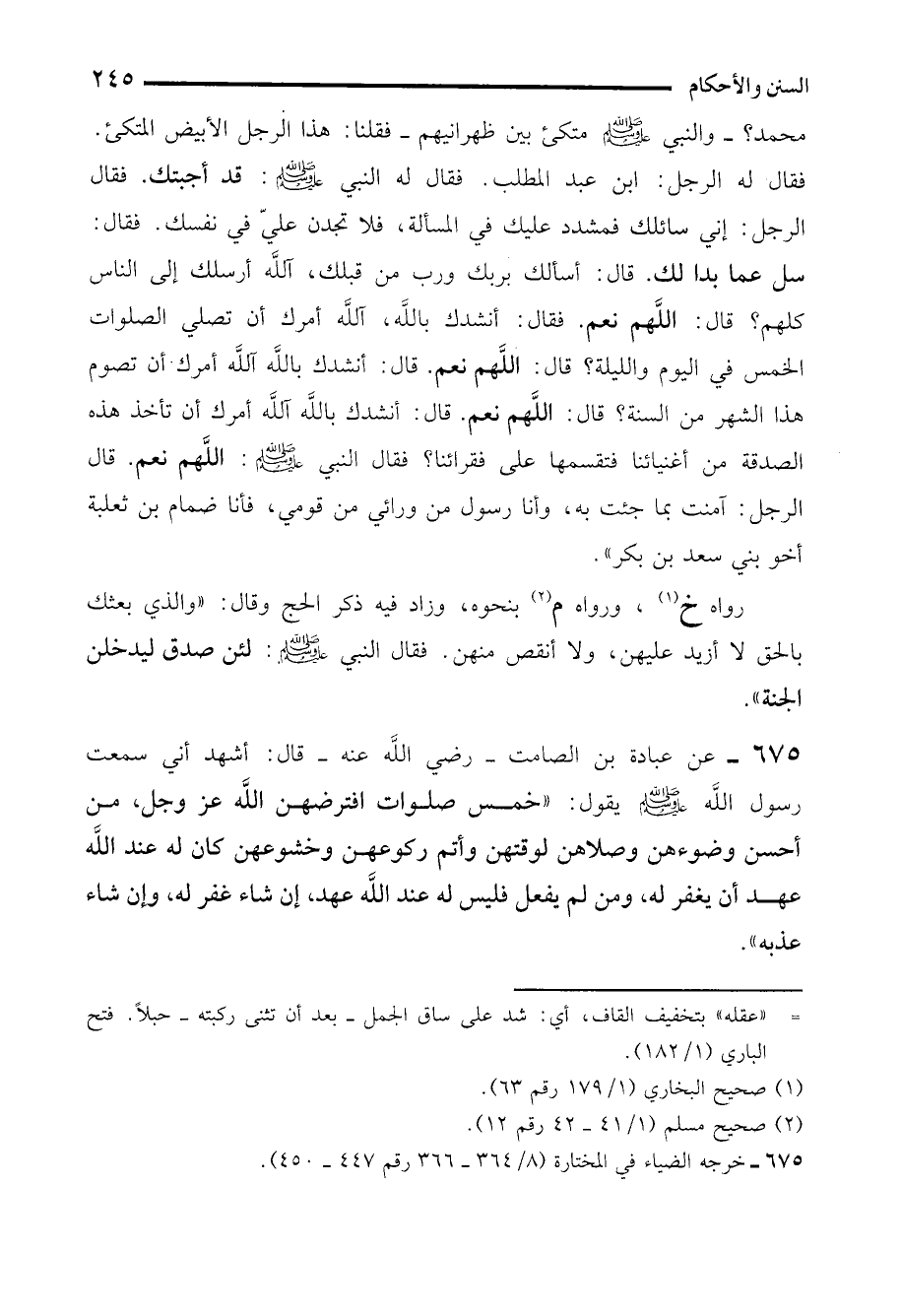 رواه خ (¬1)، ورواه م (¬2) بنحوه، وزاد فيه ذكر الحج وقال: "والذي بعثك بالحق لا أزيد عليهن، ولا أنقص منهن. فقال النبي - صلى الله عليه وسلم -: لئن صدق ليدخلن الجنة".