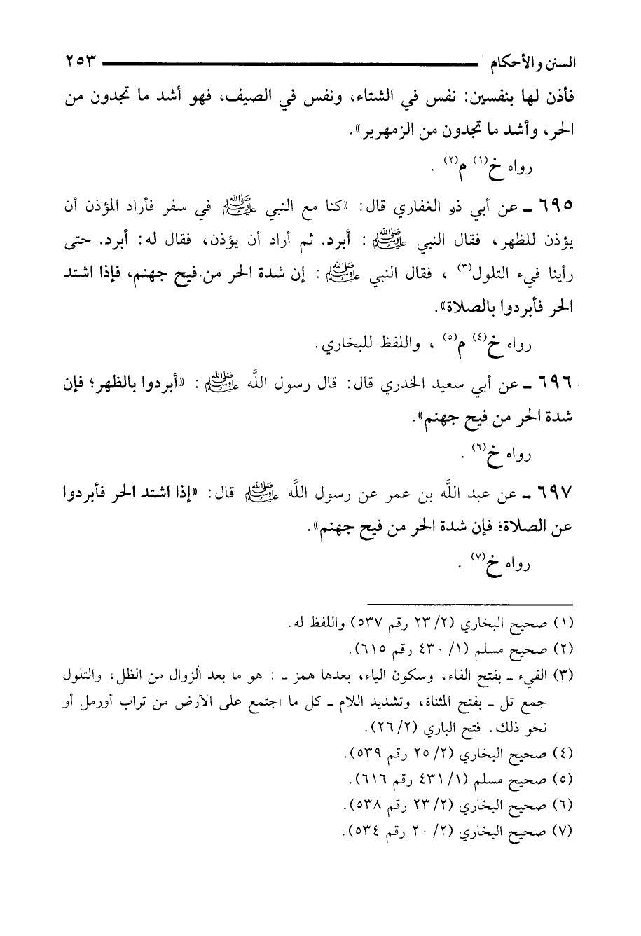 695 - عن أبي ذر الغفاري قال: "كنا مع النبي - صلى الله عليه وسلم - سفر فأرأد المؤذن أن يؤذن للظهر، فقال النبي - صلى الله عليه وسلم -: أبرد. ثم أراد أن يؤذن، فقال له: أبرد. حتى رأينا فيء التلول (¬3)، فقال النبي - صلى الله عليه وسلم - إن شدة الحر من فيح جهنم، فإذا اشتد الحر فأبردوا بالصلاة".