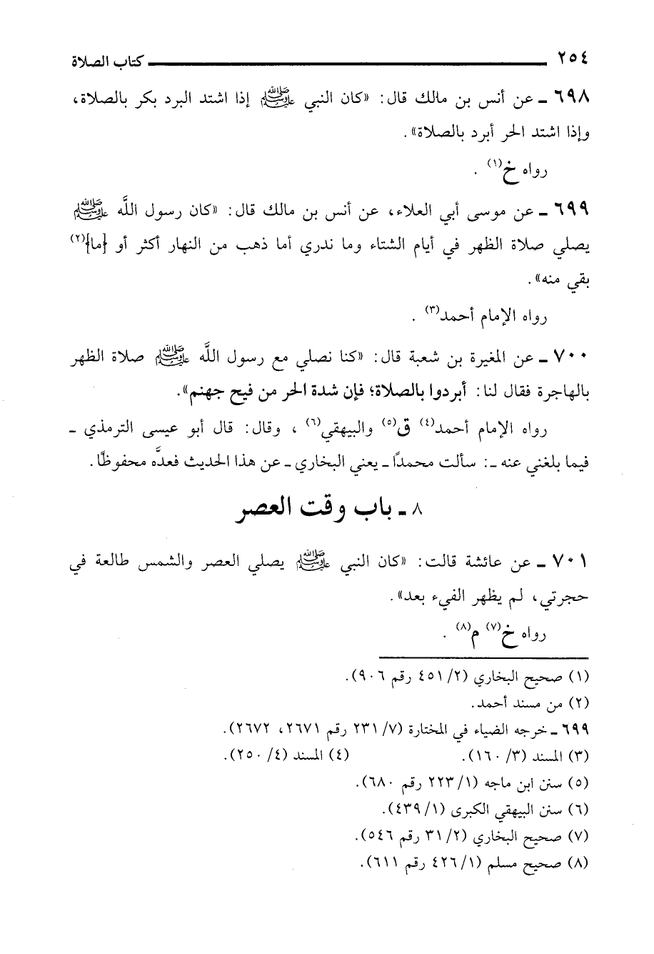 700 - عن المغيرة بن شعبة قال: "كنا نصلي مع رسول الله - صلى الله عليه وسلم - صلاة الظهر بالهاجرة فقال لنا: أبردوا بالصلاة؛ فإن شدة الحر من فيح جهنم".