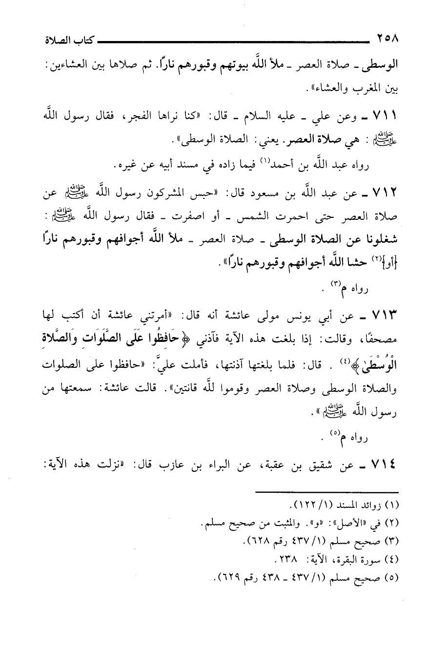 712 - عن عبد الله بن مسعود قال: "حبس المشركون رسول الله - صلى الله عليه وسلم - عن صلاة العصر حتى احمرت الشمس -أو اصفرت- فقال رسول الله - صلى الله عليه وسلم -: شغلونا عن الصلاة الوسطى -صلاة العصر- ملأ الله أجوافهم وقبورهم نارًا (أو) (¬2) حشا الله أجوافهم وقبورهم نارًا".