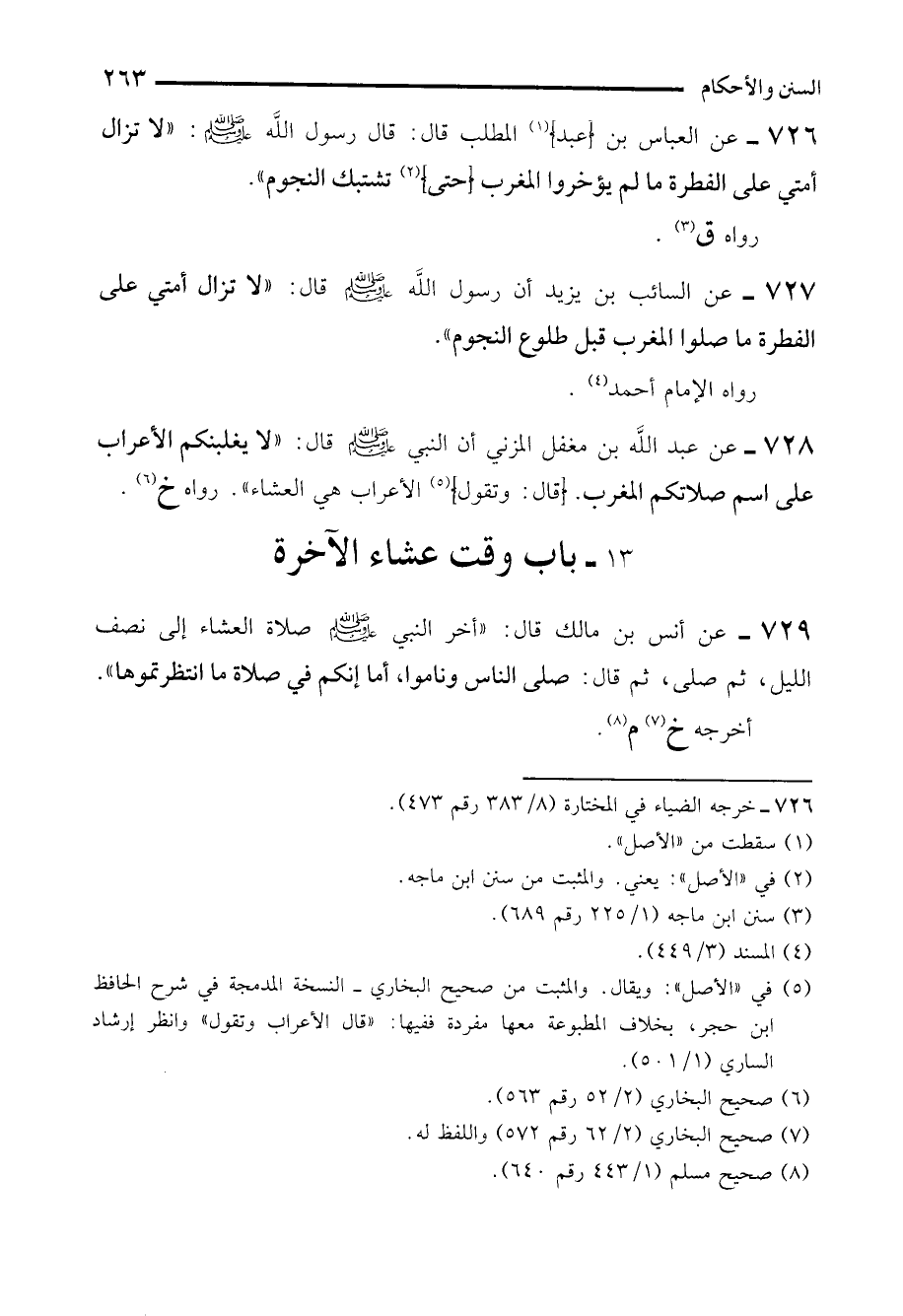 726 - عن العباس بن (عبد) (¬1) الطلب قال: قال رسول الله - صلى الله عليه وسلم - "لا تزال أمتي على الفطرة ما لم يؤخروا المغرب (حتى) (¬2) تشتبك النجوم".