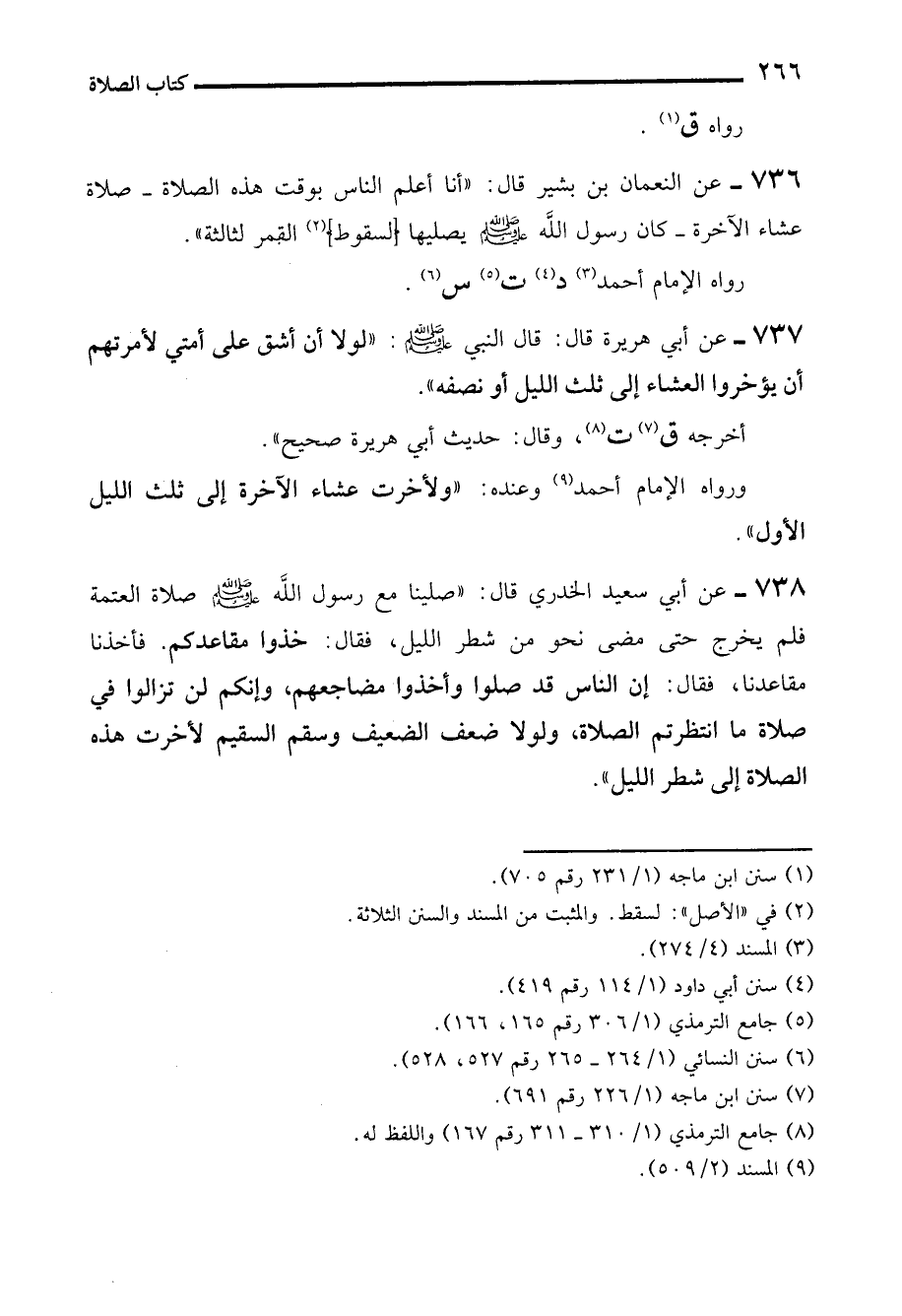 736 - عن النعمان بن بشير قال: "أنا أعلم الناس بوقت هذه الصلاة -صلاة عشاء الآخرة- كان رسول الله - صلى الله عليه وسلم - يصليها (لسقوط) (¬2) القمر لثالثة".
