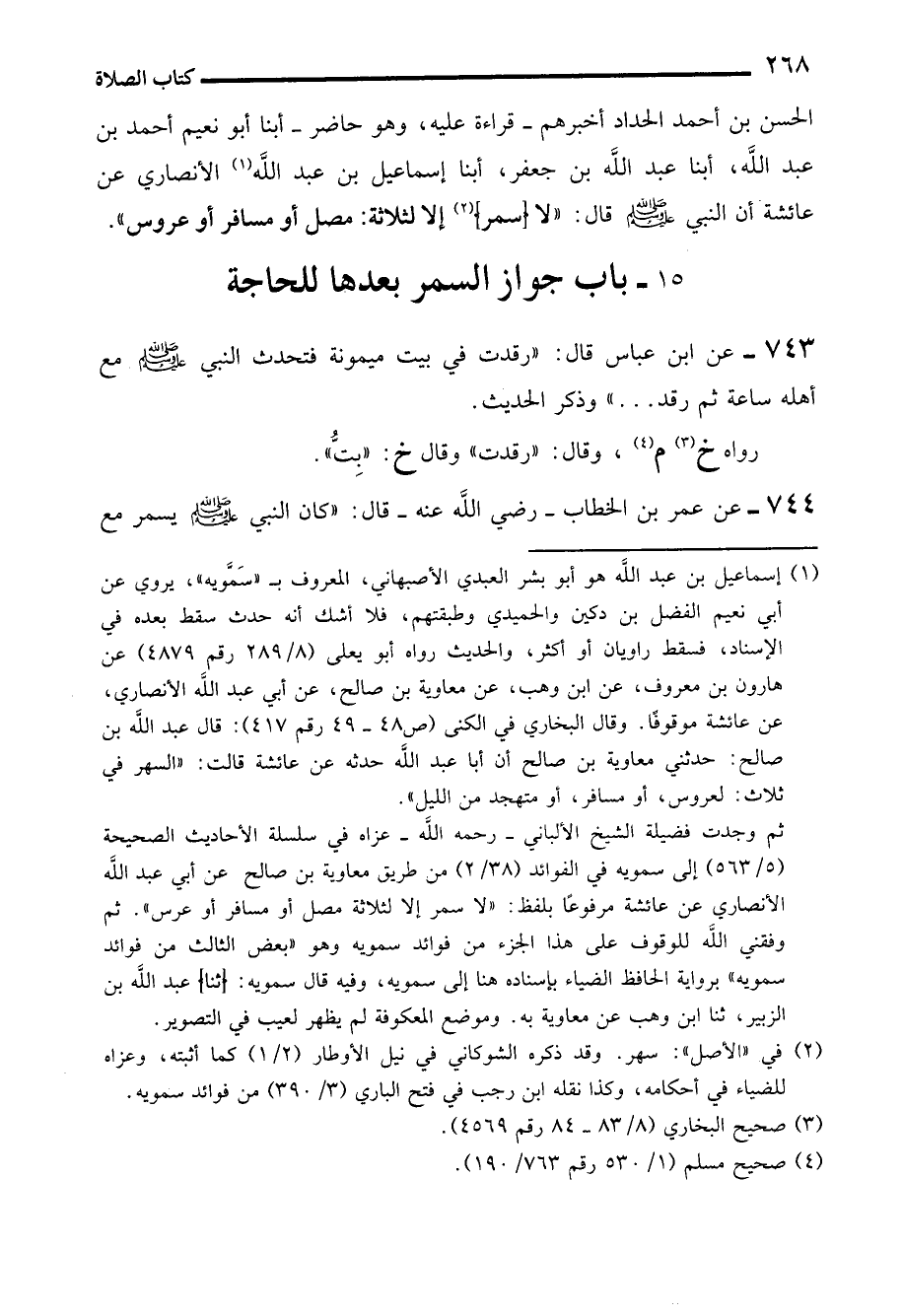 الحسن بن أحمد الحداد أخبرهم -قراءة عليه، وهو حاضر- أبنا أبو نعيم أحمد بن عبد الله، أبنا عبد الله بن جعفر، أبنا إسماعيل بن عبد الله (¬1) الأنصاري عن عائشة أن النبي - صلى الله عليه وسلم - قال: "لا (سمر) (¬2) إلا لثلاثة: مصل أو مسافر أو عروس".