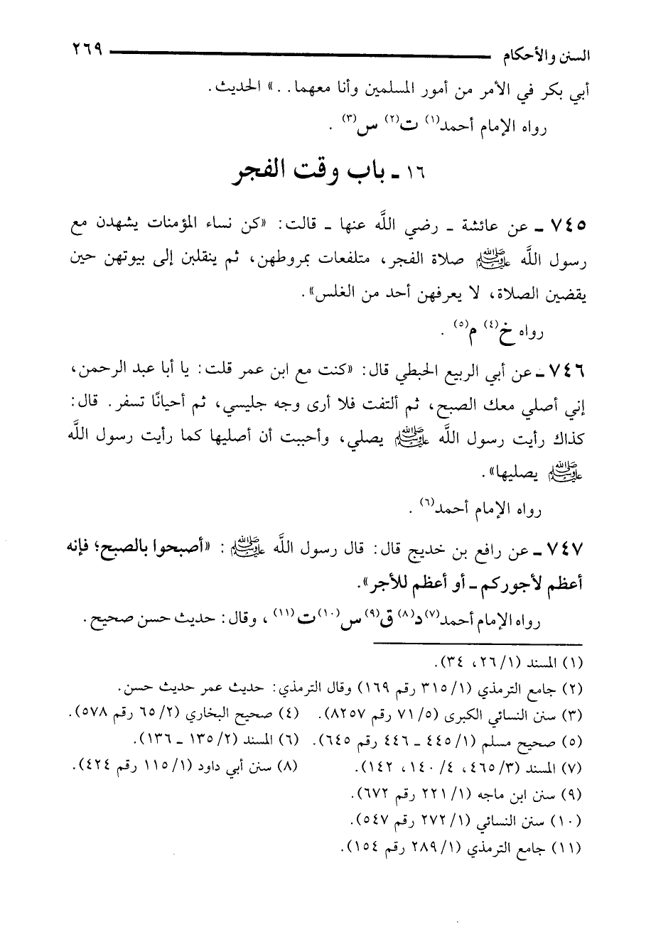 746 - عن أبي الربيع الحبطي قال: "كنت مع ابن عمر قلت: يا أبا عبد الرحمن، إني أصلي معك الصبح، ثم ألتفت فلا أرى وجه جليسي، ثم أحيانًا تسفر. قال: كذاك رأيت رسول الله - صلى الله عليه وسلم - يصلي، وأحببت أن أصليها كما رأيت رسول الله - صلى الله عليه وسلم - يصليها".