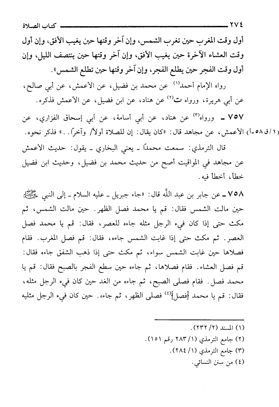 758 - عن جابر بن عبد الله قال: "جاء جبريل -عليه السلام- إلى النبي - صلى الله عليه وسلم - حين مالت الشمس فقال: قم يا محمد فصل الظهر. حين مالت الشمس، ثم مكث حتى إذا كان فيء الرجل مثله جاءه للعصر، فقال: قم يا محمد فصل العصر. ثم مكث حتى إذا غابت الشمس جاءه، فقال: قم فصل المغرب. فقام فصلاها حين غابت الشمس سواء، ثم مكث حتى إذا ذهب الشفق جاءه فقال: قم فصل العشاء. فقام فصلاها، ثم جاءه حين سطع الفجر بالصبح فقال: قم يا محمد فصل. فقام فصلى الصبح، ثم جاءه من الغد حين كان فيء الرجل مثله، فقال: قم يا محمد (فصل) (¬4) فصلى الظهر، ثم جاءه. حين كان فيء الرجل مثليه