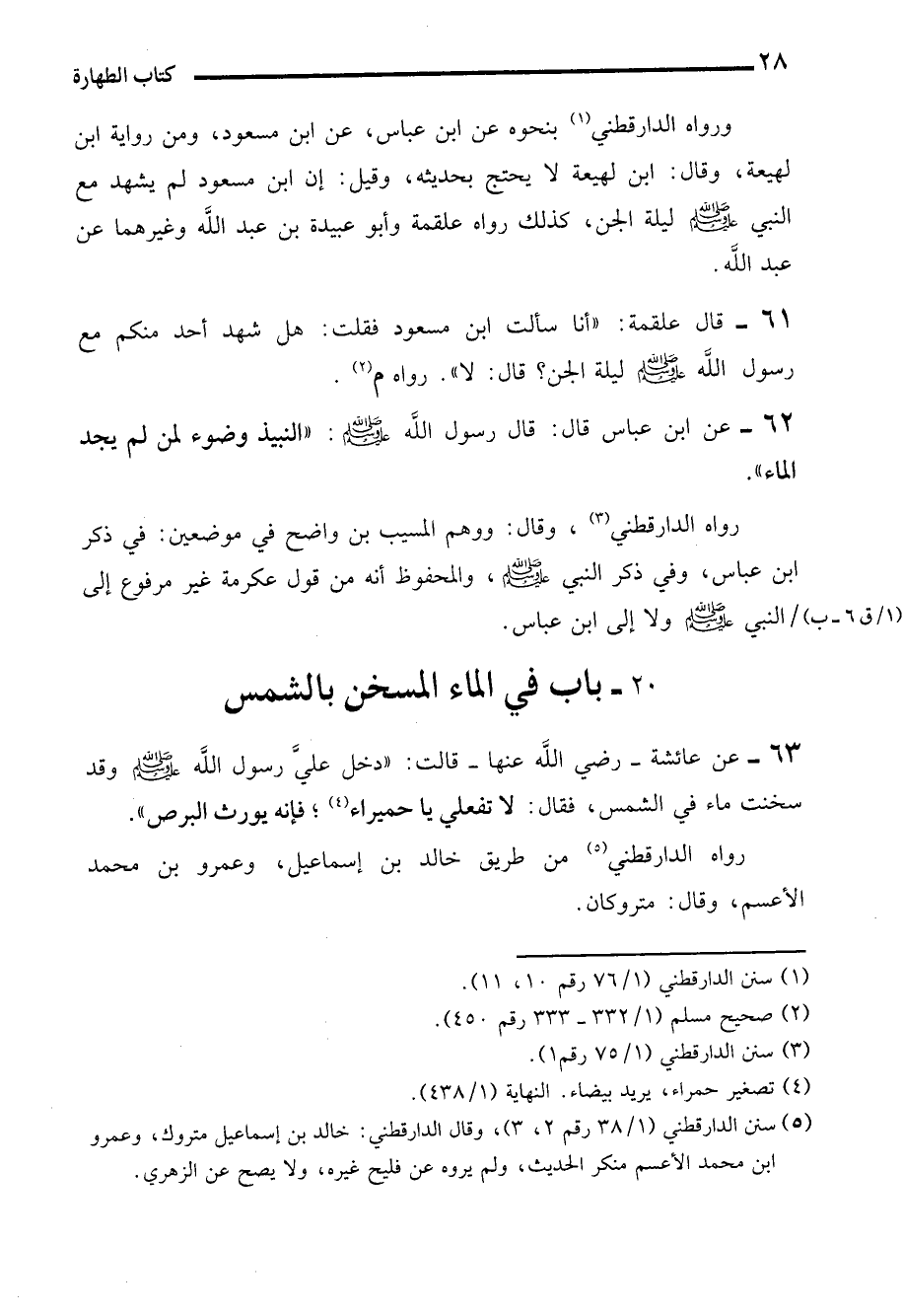 63 - عن عائشة -رضي الله عنها- قالت: "دخل عليَّ رسول الله - صلى الله عليه وسلم - وقد سخنت ماء في الشمس، فقال: لا تفعلي يا حميراء (¬4)؛ فإنه يورث البرص".