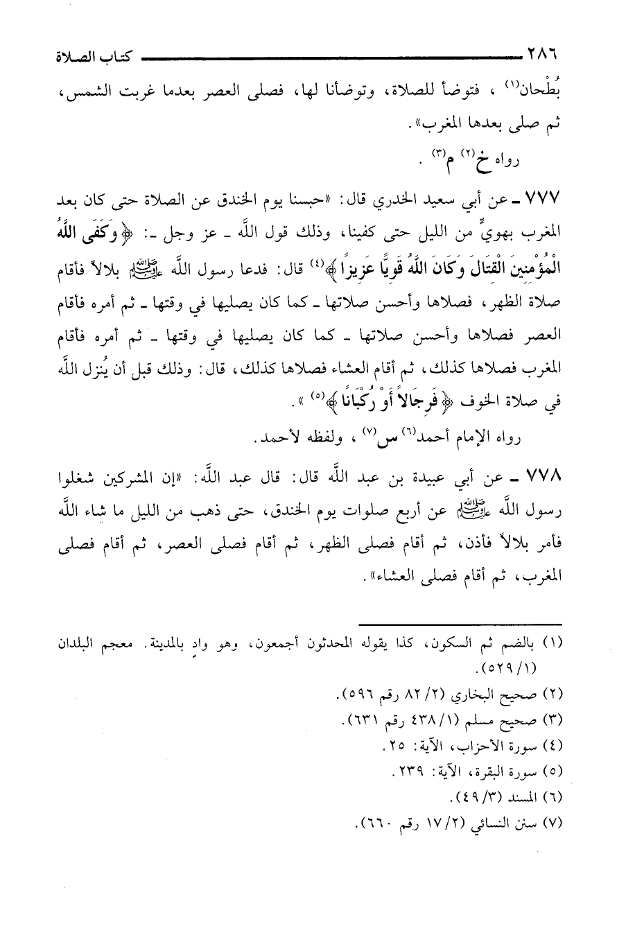 777 - عن أبي سعيد الخدري قال: "حبسنا يوم الخندق عن الصلاة حتى كان بعد المغرب بهويٍّ من الليل حتى كفينا، وذلك قول الله- عز وجل-: {وَكَفَى اللَّهُ الْمُؤْمِنِينَ الْقِتَالَ وَكَانَ اللَّهُ قَوِيًّا عَزِيزًا} (¬4) قال: فدعا رسول اللَّه - صلى الله عليه وسلم - بلالًا فأقام صلاة الظهر، فصلاها وأحسن صلاتها -كما كان يصليها في وقتها- ثم أمره فأقام العصر فصلاها وأحسن صلاتها- كما كان يصليها في وقتها- ثم أمره فأقام المغرب فصلاها كذلك، ثم أقام العشاء فصلاها كذلك، قال: وذلك قبل أن يُنزل اللَّه في صلاة الخوف (فَرِجَالاً أَوْ رُكْبَانًا) (¬5) ".