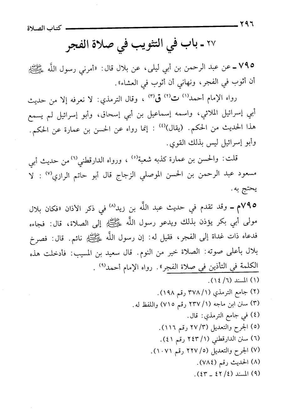 795 م- وقد تقدم في حديث عبد الله بن زيد (¬8) في ذكر الأذان "فكان بلال مولى أبي بكر يؤذن بذلك ويدعو رسول الله - صلى الله عليه وسلم - إلى الصلاة، قال: فجاءه فدعاه ذات غداة إلى الفجر، فقيل له: إن رسول الله - صلى الله عليه وسلم - نائم. قال: فصرخ بلال بأعلى صوته: الصلاة خير من النوم. قال سعيد بن المسيب: فأدخلت هذه الكلمة في التأذين في صلاة الفجر". رواه الإمام أحمد (¬9).