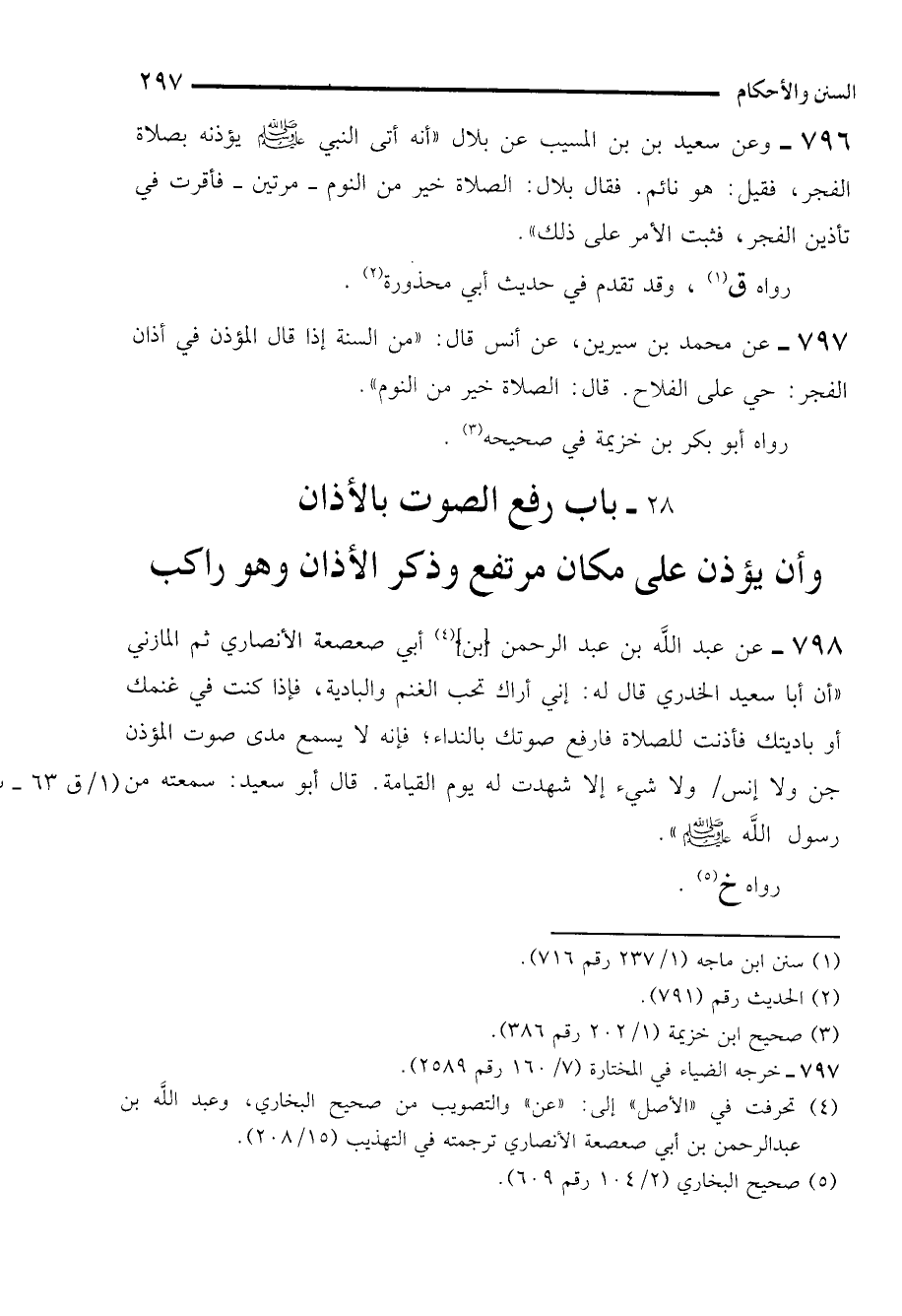 797 - عن محمد بن سيرين، عن أنس قال: "من السنة إذا قال المؤذن في أذان الفجر: حي على الفلاح. قال: الصلاة خير من النوم".