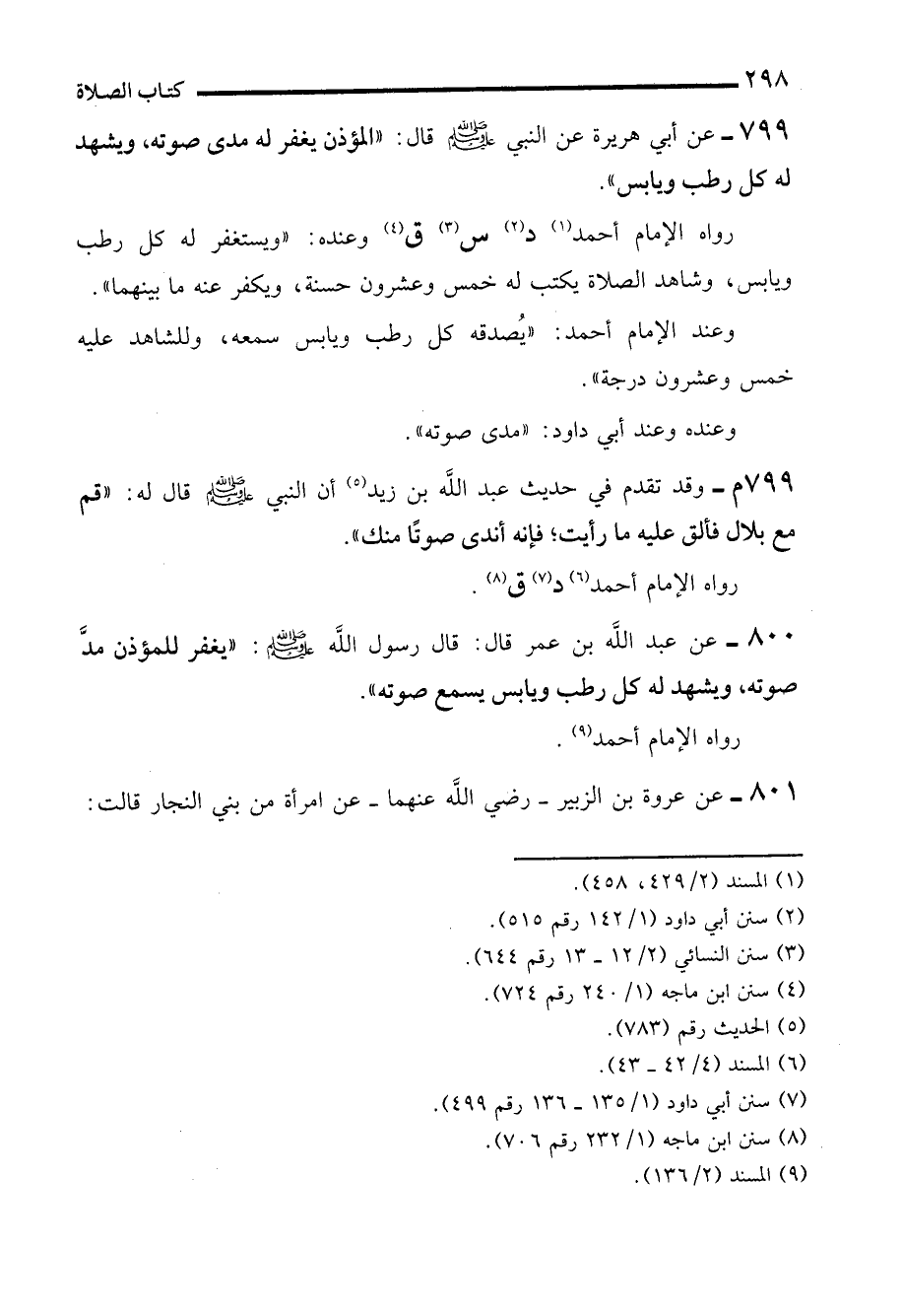 800 - عن عبد الله بن عمر قال: قال رسول الله - صلى الله عليه وسلم -: "يغفر للمؤذن مدَّ صوته، ويشهد له كل رطب ويابس يسمع صوته".