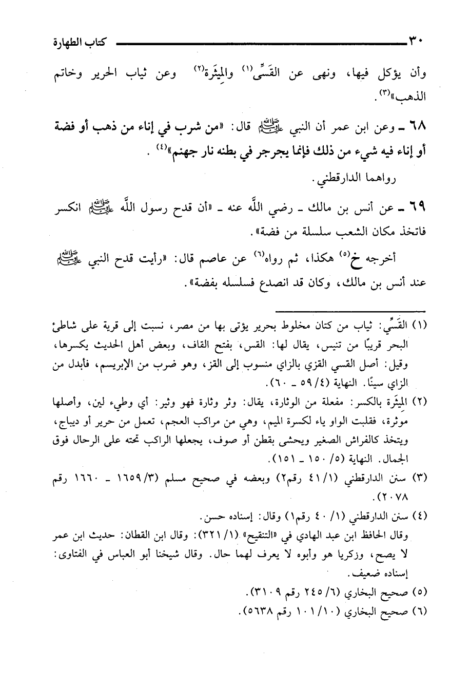 68 - وعن ابن عمر أن النبي - صلى الله عليه وسلم - قال: " من شرب في إناء من ذهب أو فضة أو إناء فيه شيء من ذلك فإنما يجرجر في بطنه نار جهنم " (¬4).