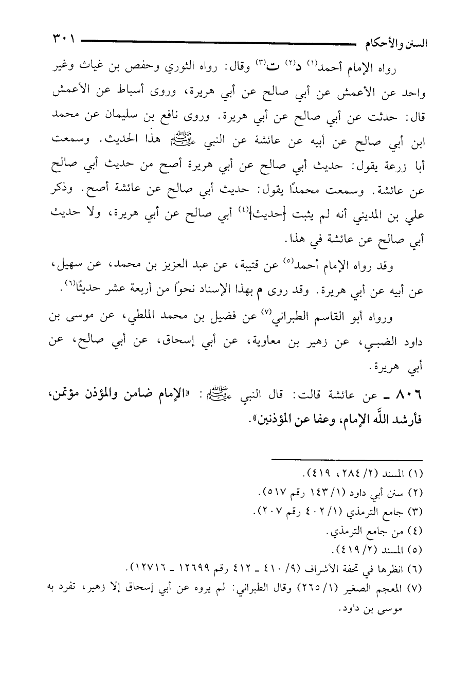 806 - عن عائشة قالت: قال النبي - صلى الله عليه وسلم -: "الإمام ضامن والمؤذن مؤتمن، فأرشد الله الإمام، وعفا عن المؤذنين".