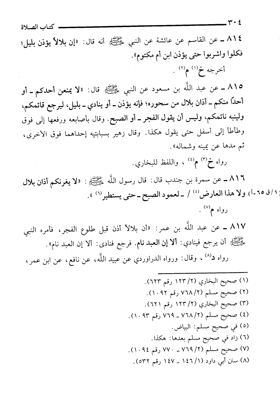817 - عن عبد الله بن عمر: "أن بلالًا أذن قبل طلوع الفجر، فأمره النبي - صلى الله عليه وسلم - أن يرجع فينادي: ألا إن العبد نام. فرجع فنادى: ألا إن العبد نام".