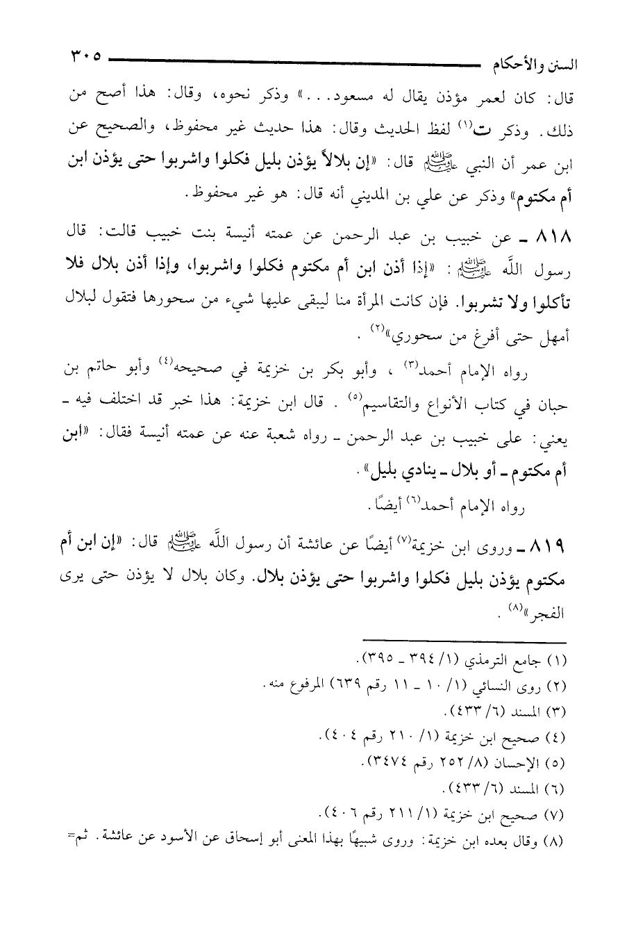 818 - عن خبيب بن عبد الرحمن عن عمته أنيسة بنت خبيب قالت: قال رسول الله - صلى الله عليه وسلم -: "إذا أذن ابن أم مكتوم فكلوا واشربوا، وإذا أذن بلال فلا تأكلوا ولا تشربوا. فإن كانت المرأة منا ليبقى عليها شيء من سحورها فتقول لبلال أمهل حتى أفرغ من سحوري" (¬2).