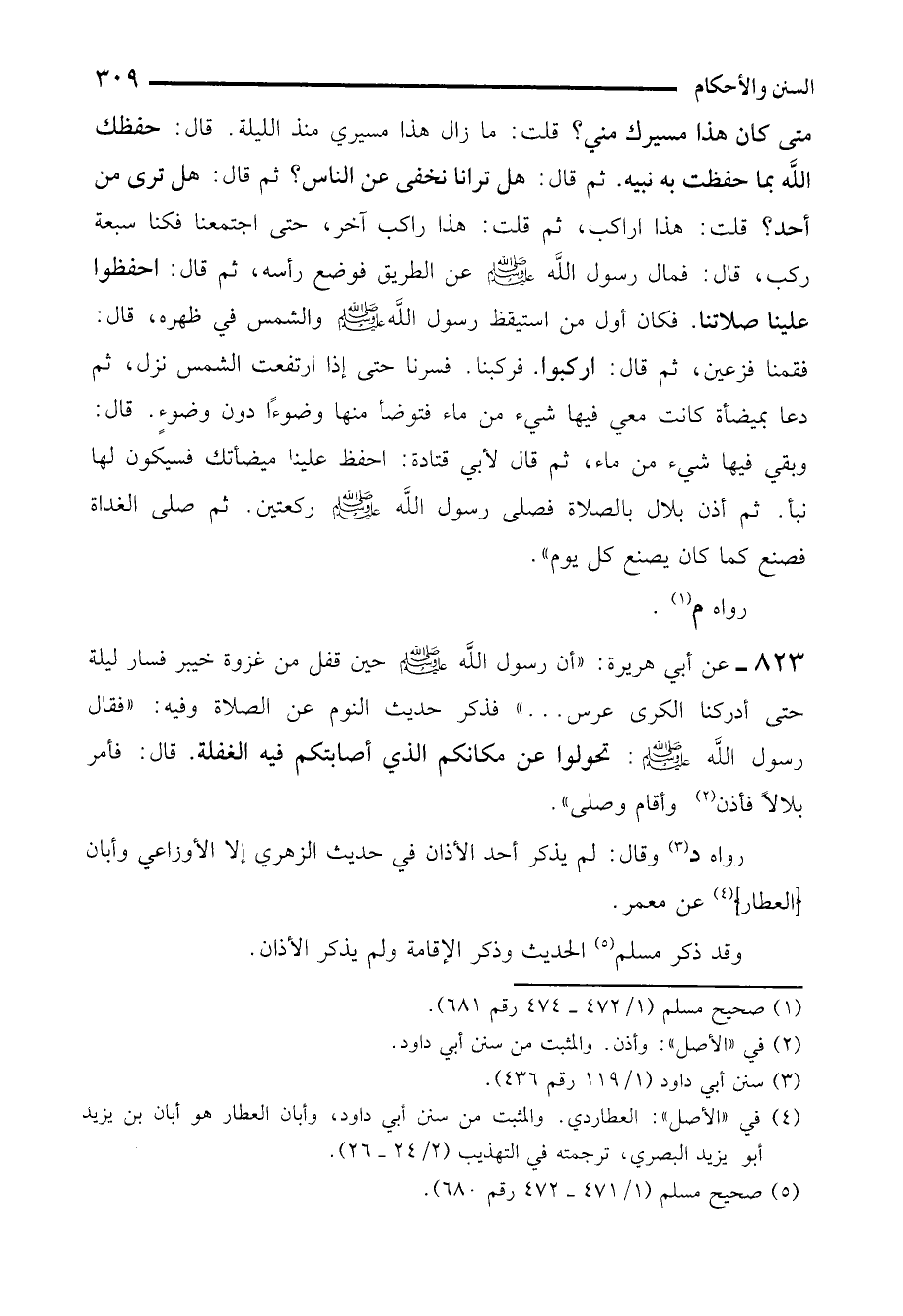 متى كان هذا مسيرك مني؟ قلت: ما زال هذا مسيري منذ الليلة. قال: حفظك الله بما حفظت بن نبيه. ثم قال: هل ترانا نخفى عن الناس؟ ثم قال: هل ترى من أحد؟ قلت: هذا راكب، ثم قلت: هذا راكب آخر، حتى اجتمعنا فكنا سبعة ركب، قال: فمال رسول الله - صلى الله عليه وسلم - عن الطريق فوضع رأسه، ثم قال: احفظوا علينا صلاتنا. فكان أول من استيقظ رسول الله - صلى الله عليه وسلم - والشمس في ظهره، قال: فقمنا فزعين، ثم قال: اركبوا. فركبنا. فسرنا حتى إذا ارتفعت الشمس نزل، ثم دعا بميضأة كانت معي فيها شيء من ماء فتوضأ منها وضوءًا دون وضوءٍ. قال: وبقي فيها شيء من ماء، ثم قال لأبي قتادة: احفظ علينا ميضأتك فسيكون لها نبأ. ثم أذن بلال بالصلاة فصلى رسول الله - صلى الله عليه وسلم - ركعتين. ثم صلى الغداة فصنع كما كان يصنع كل يوم".