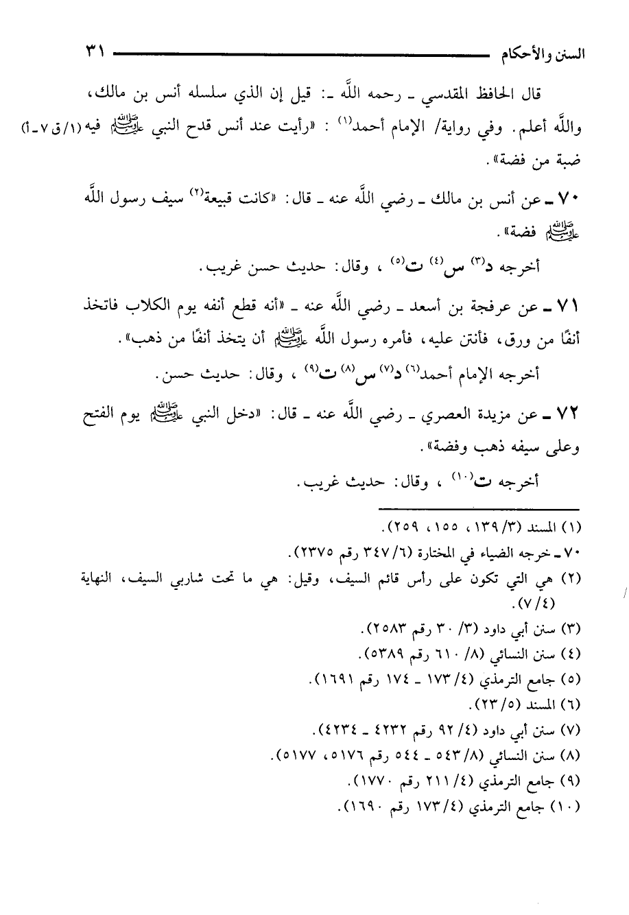 70 - عن أنس بن مالك -رضي الله عنه- قال: "كانت قبيعة (¬2) سيف رسول الله - صلى الله عليه وسلم - فضة".