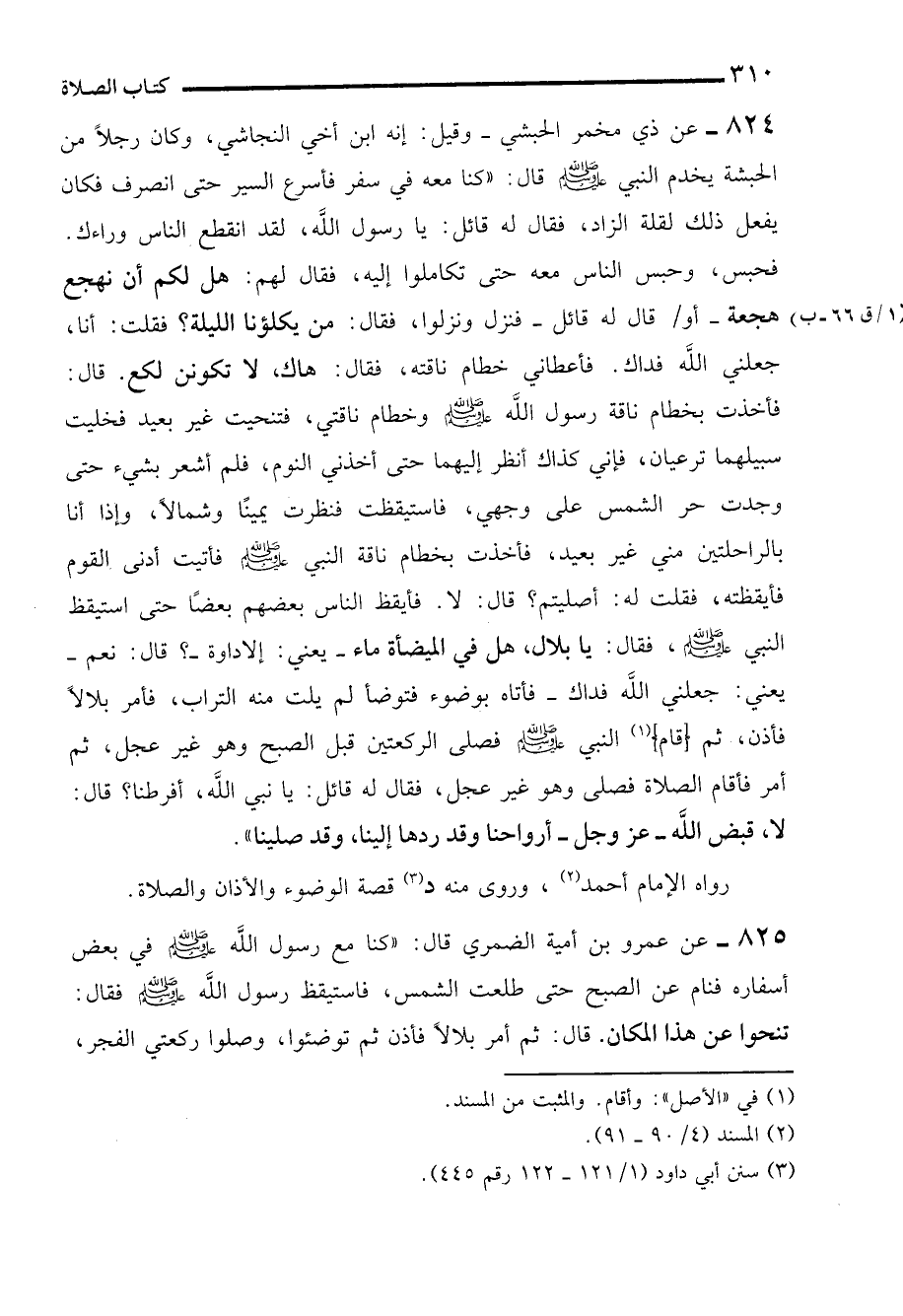 825 - عن عمرو بن أمية الضمري قال: "كنا مع رسول الله - صلى الله عليه وسلم - في بعض أسفاره فنام عن الصبح حتى طلعت الشمس، فاستيقظ رسول الله - صلى الله عليه وسلم - فقال: تنحوا عن هذا المكان. قال: ثم أمر بلالًا فأذن ثم توضئوا، وصلوا ركعتي الفجر،