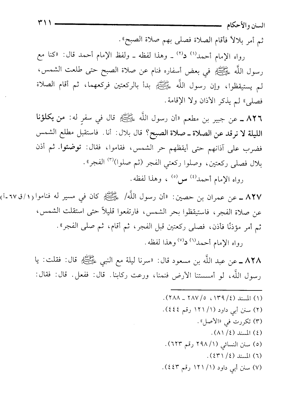828 - عن عبد الله بن مسعود قال: "سرنا ليلة مع النبي - صلى الله عليه وسلم - قال: فقلت: يا رسول الله، لو أمسستنا الأرض فنمنا، ورعت ركابنا. قال: ففعل. قال: فقال: