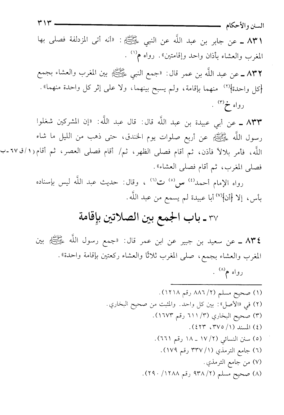 834 - عن سعيد بن جبير عن ابن عمر قال: "جمع رسول الله - صلى الله عليه وسلم - بين المغرب والعشاء بجمع، صلى المغرب ثلاثًا والعشاء ركعتين بإقامة واحدة".