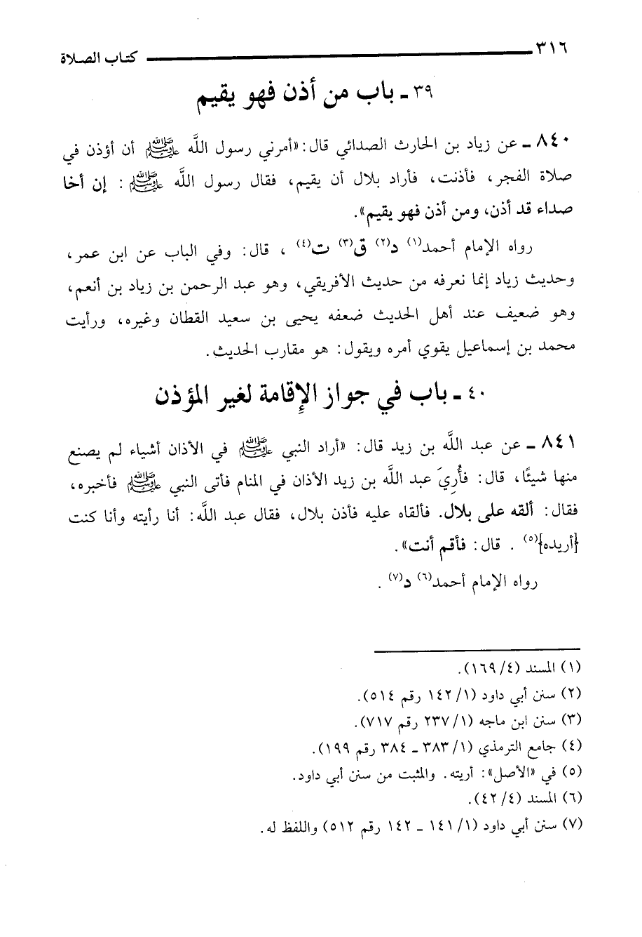 840 - عن زياد بن الحارث الصدائي قال: "أمرني رسول الله - صلى الله عليه وسلم - أن أؤذن في صلاة الفجر، فأذنت، فأراد بلال أن يقيم، فقال رسول الله - صلى الله عليه وسلم - إن أخا صداء قد أذن، ومن أذن فهو يقيم".