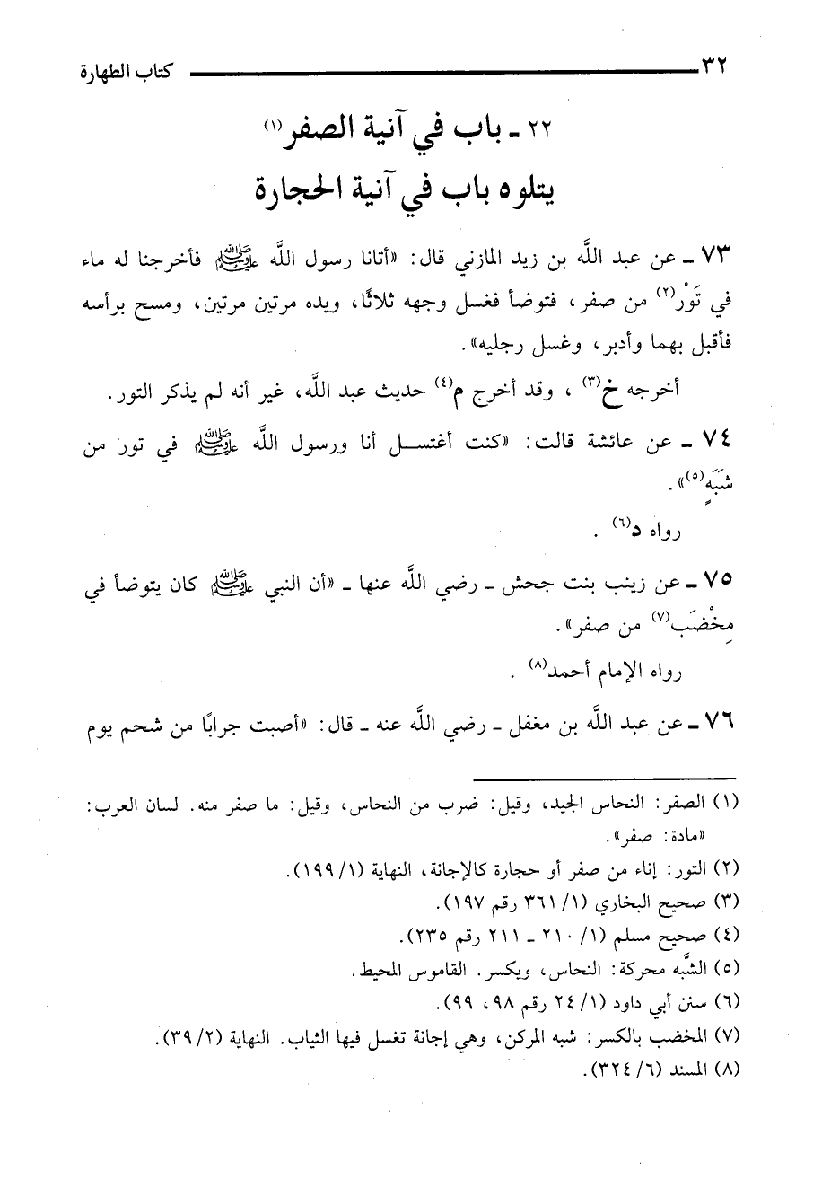 75 - عن زينب بنت جحش -رضي الله عنها- "أن النبي - صلى الله عليه وسلم - كان يتوضأ في مِخْضَب (¬7) من صفر".